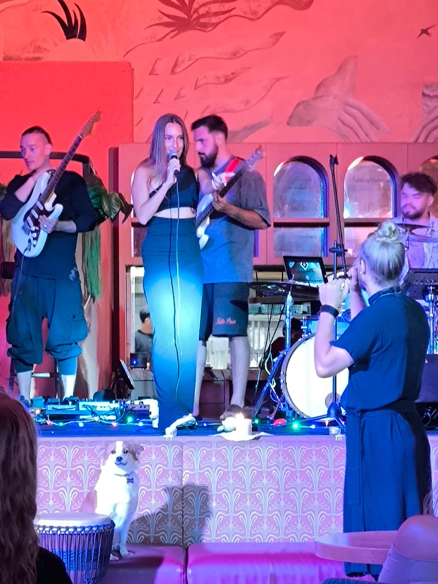 The image shows a live music performance taking place at a venue in North Kuta, Indonesia. On a raised stage, a female vocalist in a black crop top and a long blue skirt is singing into a microphone.…read more