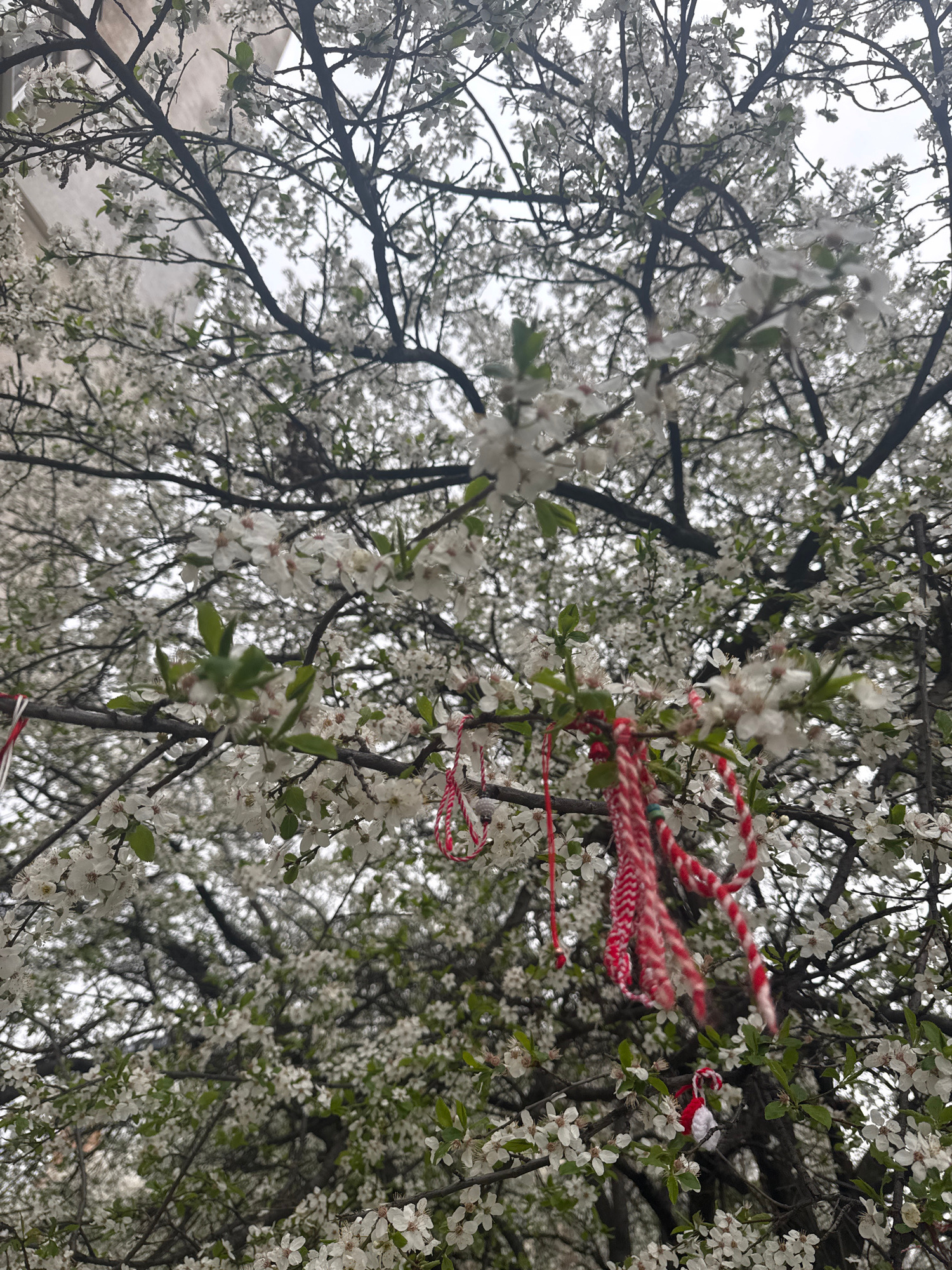 The image shows a tree in full bloom with white flowers. Red and white yarn decorations, Martenitsas, are tied to the branches. The location is likely Sofia, Bulgaria, given that the Martenitsa is a B…read more