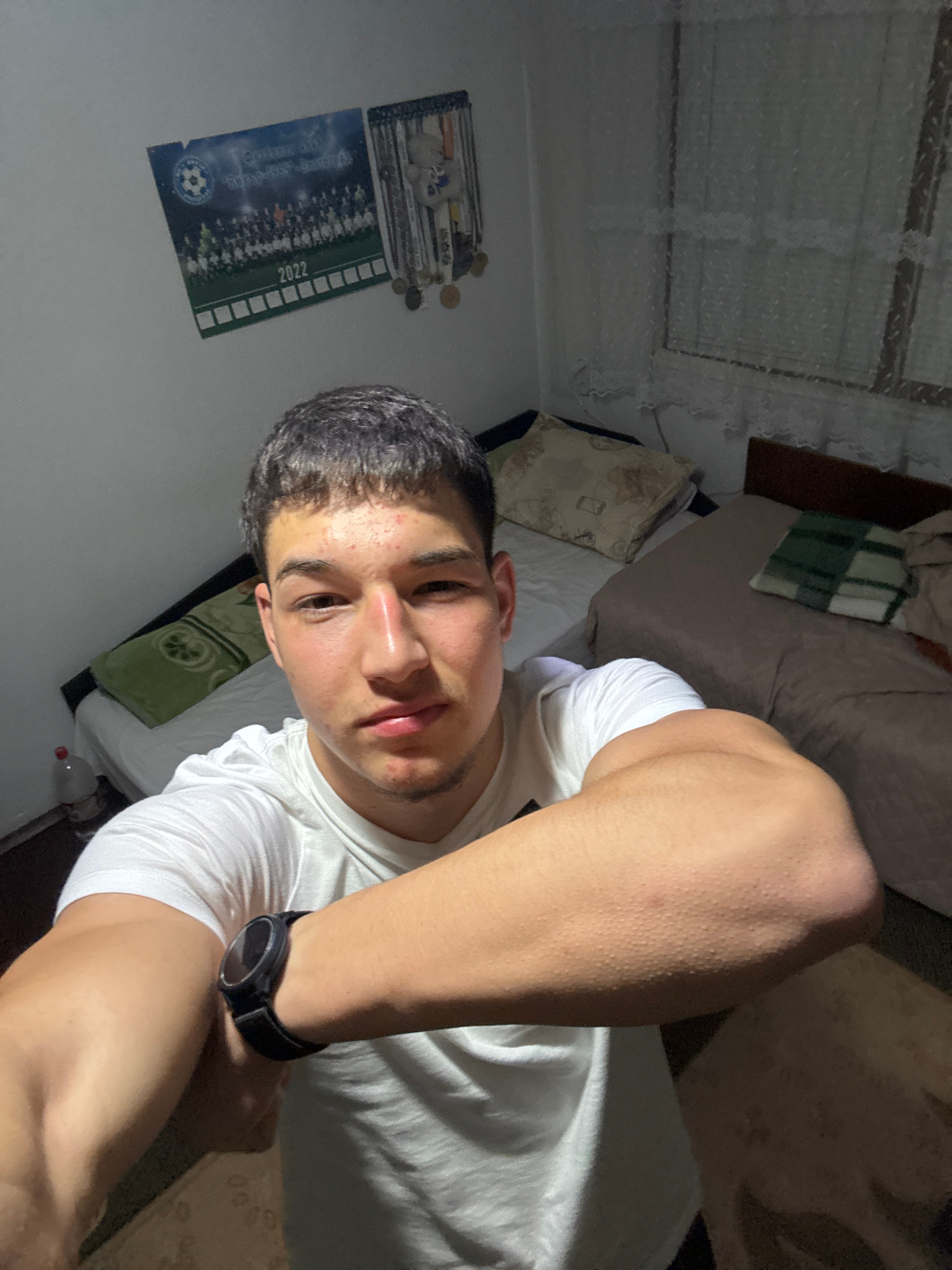 A selfie from the chest up shows a person with short dark hair, light skin, and a white T-shirt with a black smartwatch on their left wrist. The background shows a bedroom with a bed and a window with…read more