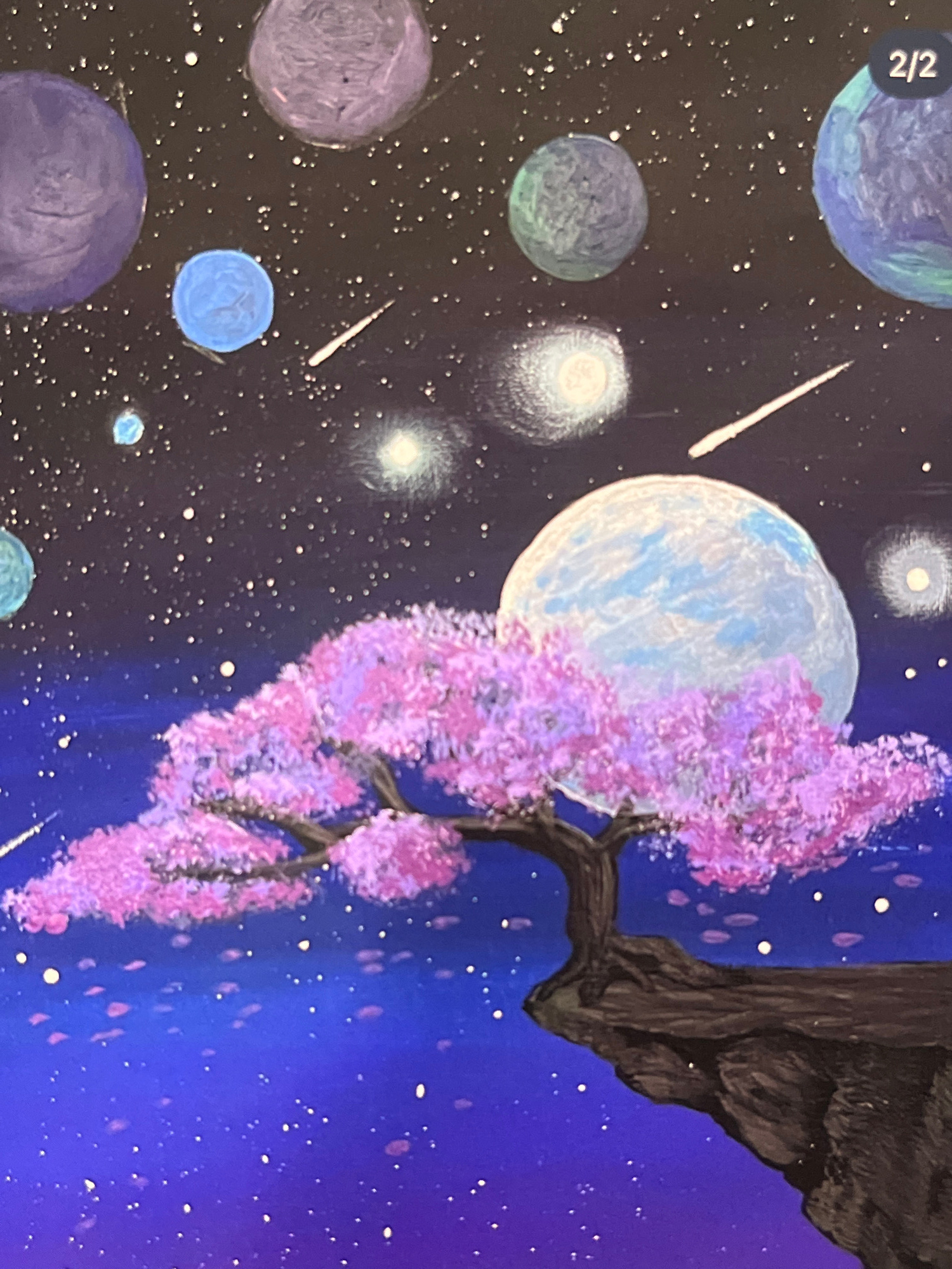 The image is a painting depicting a space scene with various celestial bodies. There are several planets in the painting, rendered in shades of blue, purple, and green, with some appearing to have visβ¦read more