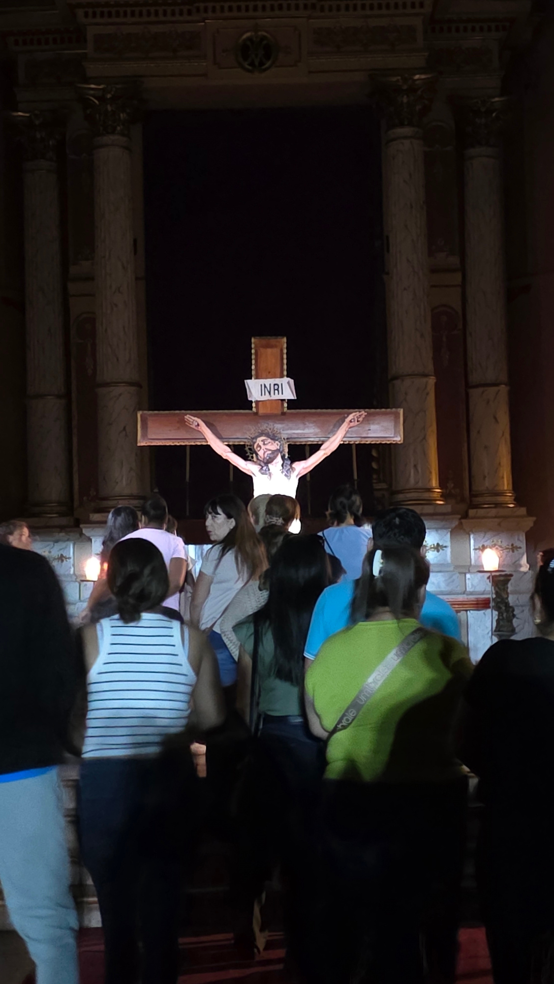 A photograph shows a vertical image of a crucifix placed within a religious setting. The crucifix features the figure of Jesus Christ, and above his head, there is a sign with the inscription "INRI".…read more