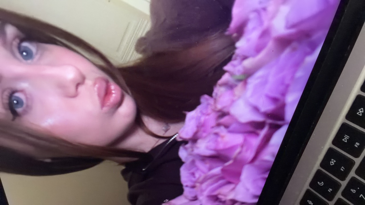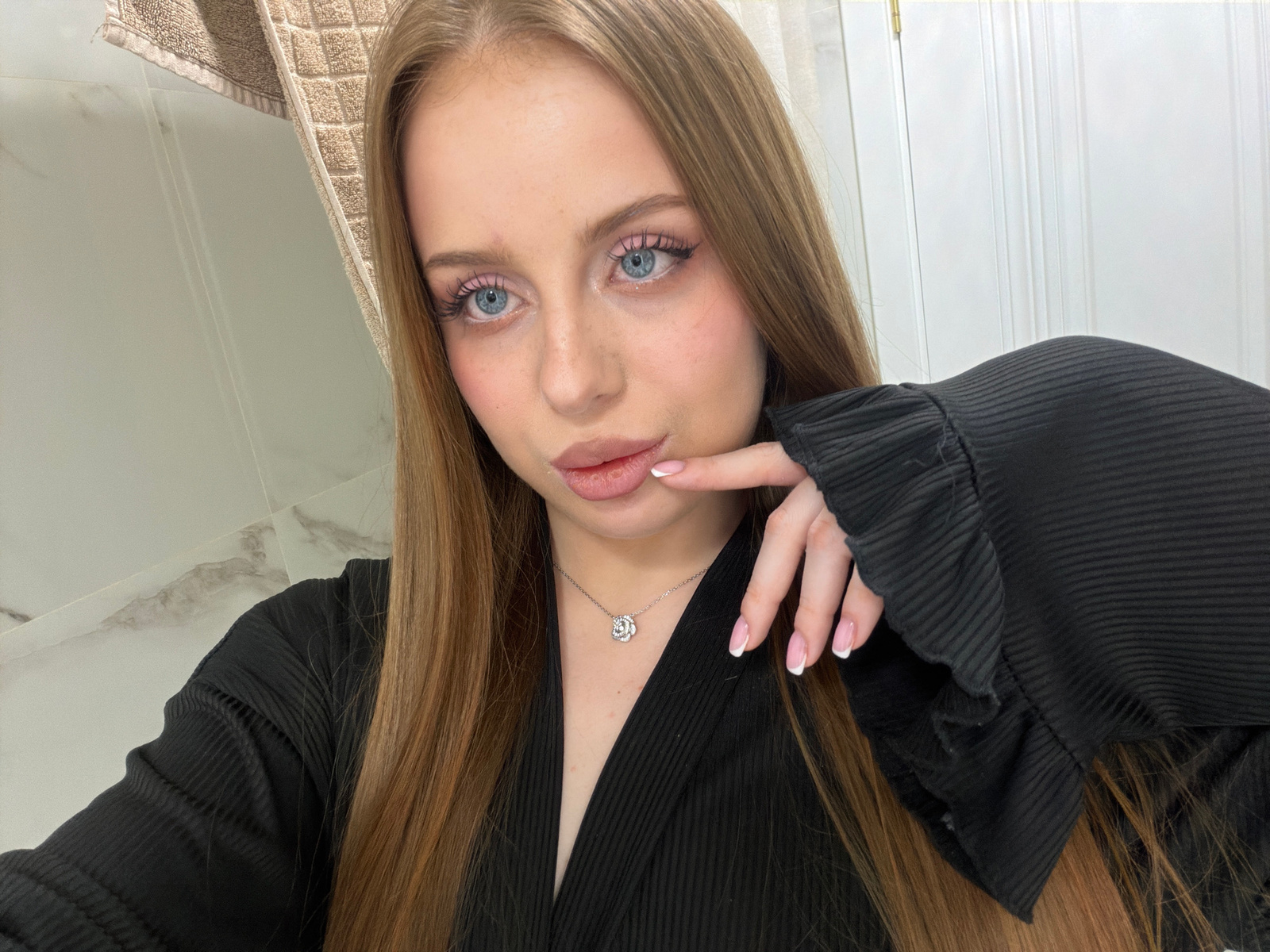 A young woman with fair skin, light brown hair, and blue eyes is positioned with her head tilted downwards. She is wearing a black, textured top and a delicate silver necklace with a floral pendant. H…read more