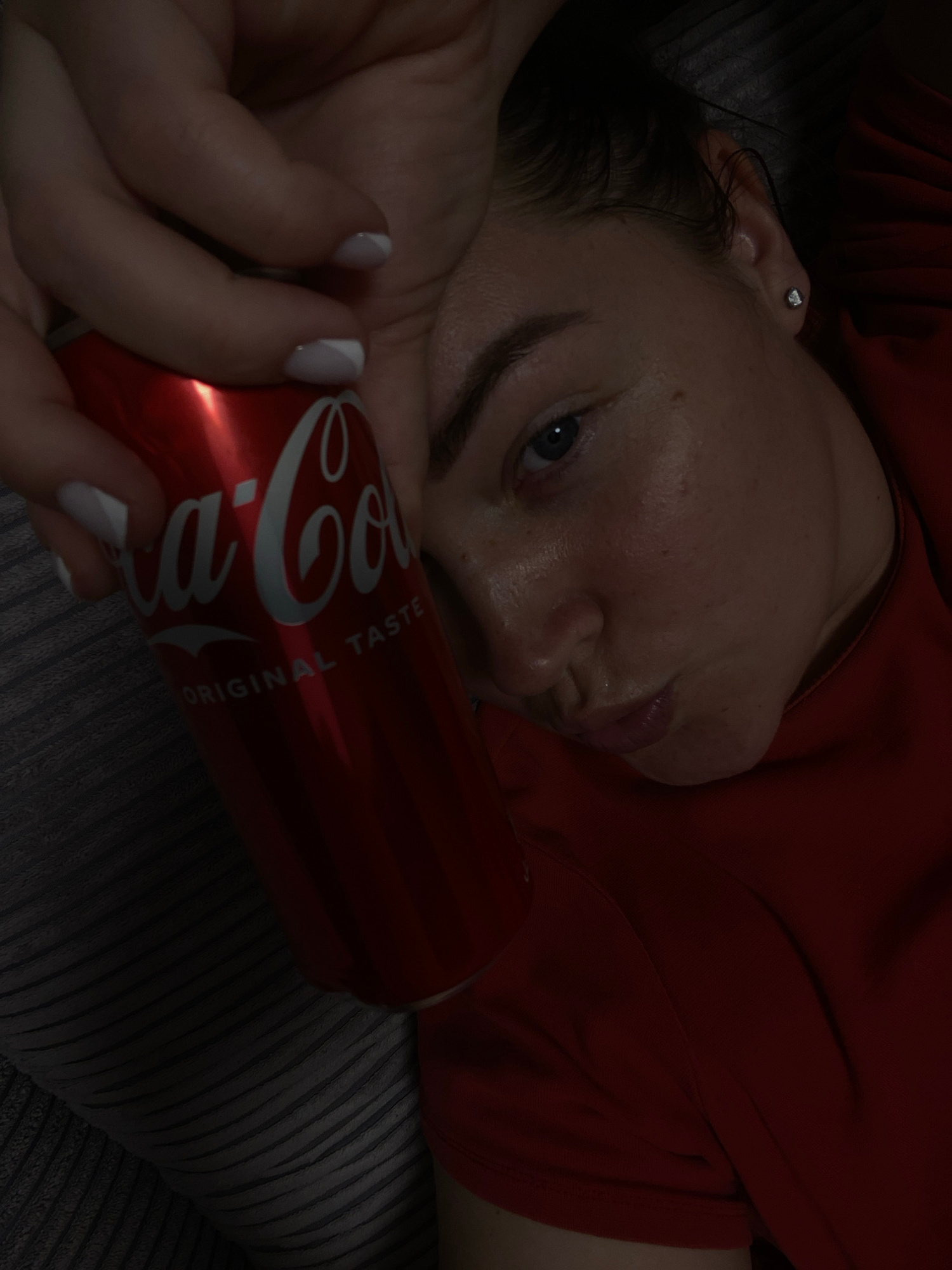 A woman is lying down, holding a can of Coca-Cola. She has fair skin, blue eyes, and an earring in her left ear. Her nails are painted with white tips. She is wearing a red shirt. The background appea…read more
