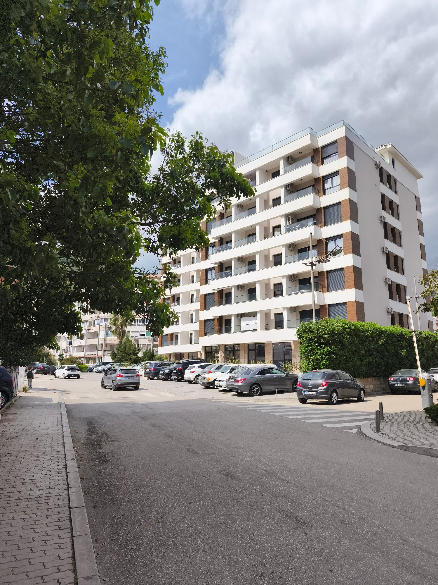 This image captures a bright daytime street scene in Budva, Montenegro, under a sky filled with scattered white and grey clouds. The main subject is a modern, multi-story building, likely residential,…read more