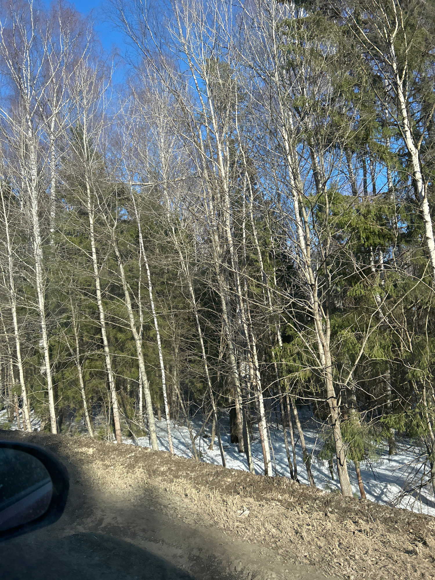 The image, taken in Kamennyi Kliuch, Russia, shows a view of a forest through a vehicle window. The forest consists primarily of tall, thin trees with white bark, likely birch, interspersed with everg…read more