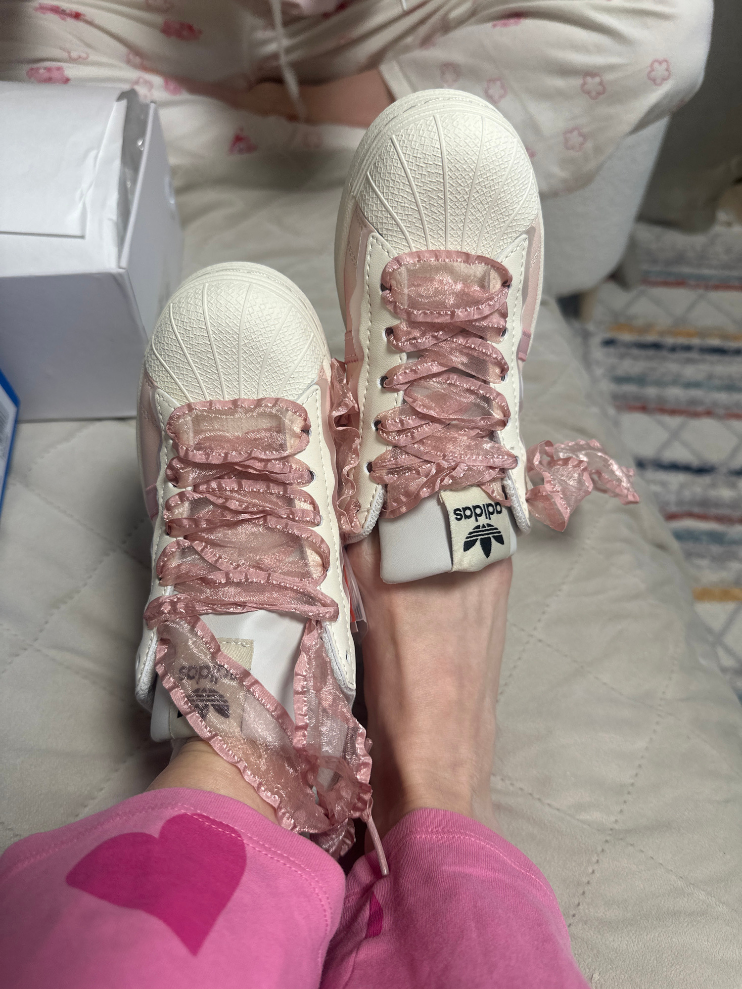 The image shows a pair of white Adidas Superstar sneakers with light pink, ruffled ribbon laces. The sneakers are placed on a quilted light beige surface, likely a bed or sofa. A person wearing light…read more