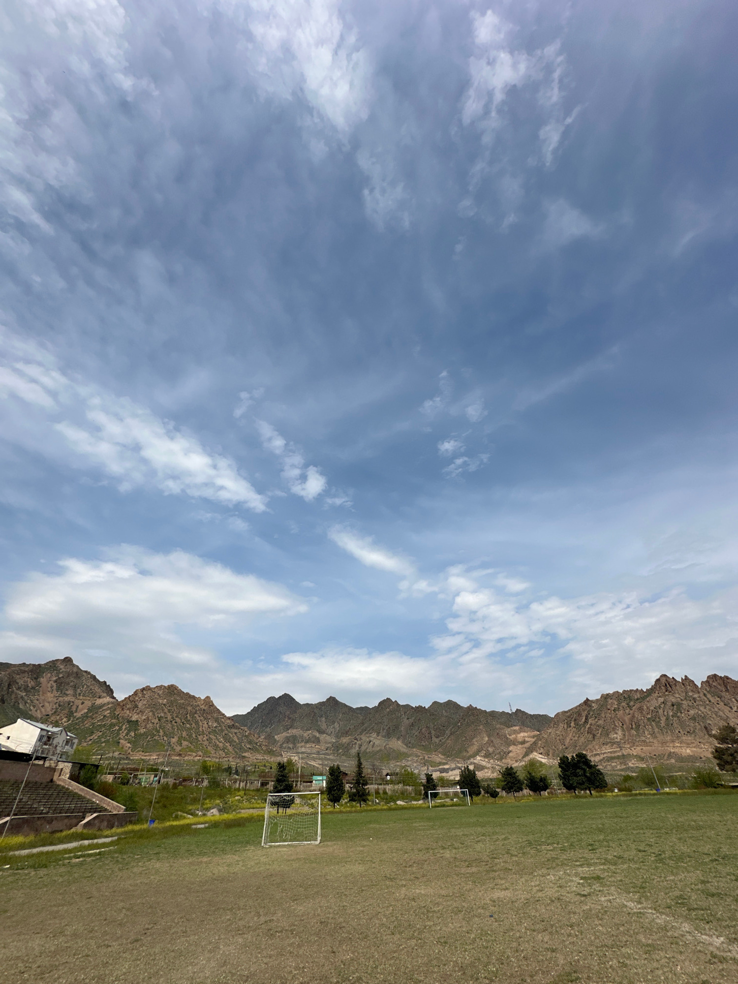 The image depicts a soccer field in Agarak, Armenia, set against a backdrop of mountains and a partly cloudy sky. The field is mostly green, though it appears somewhat dry in areas. A white soccer goa…read more