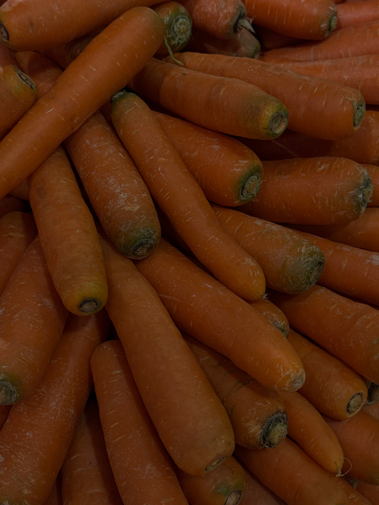A close-up shot depicts a jumble of orange carrots, their blunt-cut ends visible. The scene is darkly lit, obscuring details. No people, subjects, or interactions are apparent. The environment is conf…read more