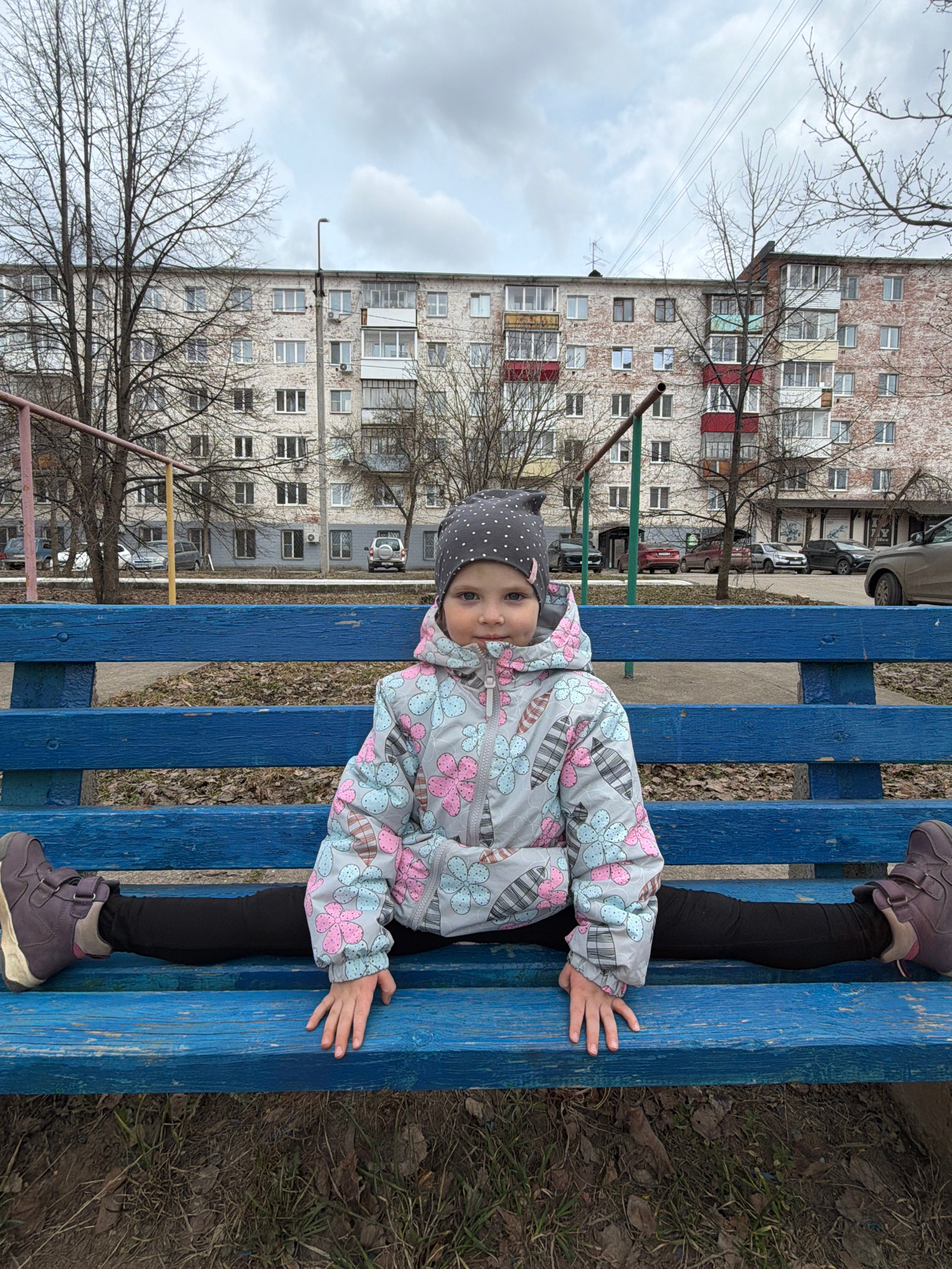 A young child sits in a split position on a blue bench. The child wears a gray and pink floral-patterned jacket and a gray, polka-dotted hat. The child is facing the camera with a neutral expression.…read more