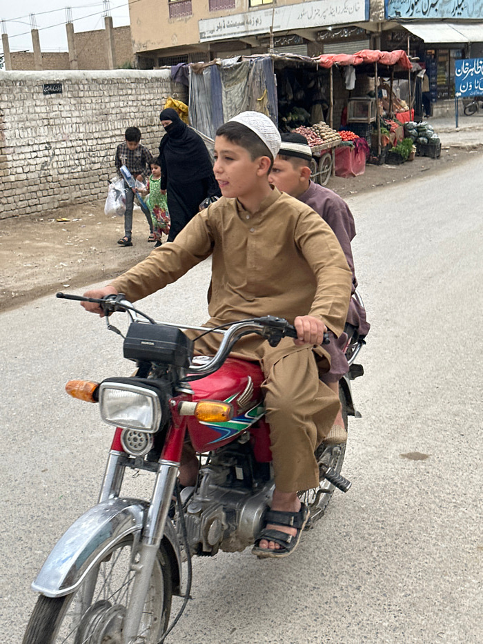 The image depicts a street scene in Quetta City Tehsil, Pakistan, under an overcast sky. In the immediate foreground, a red Honda motorcycle is in motion on an asphalt road. A young male driver, weariβ¦read more