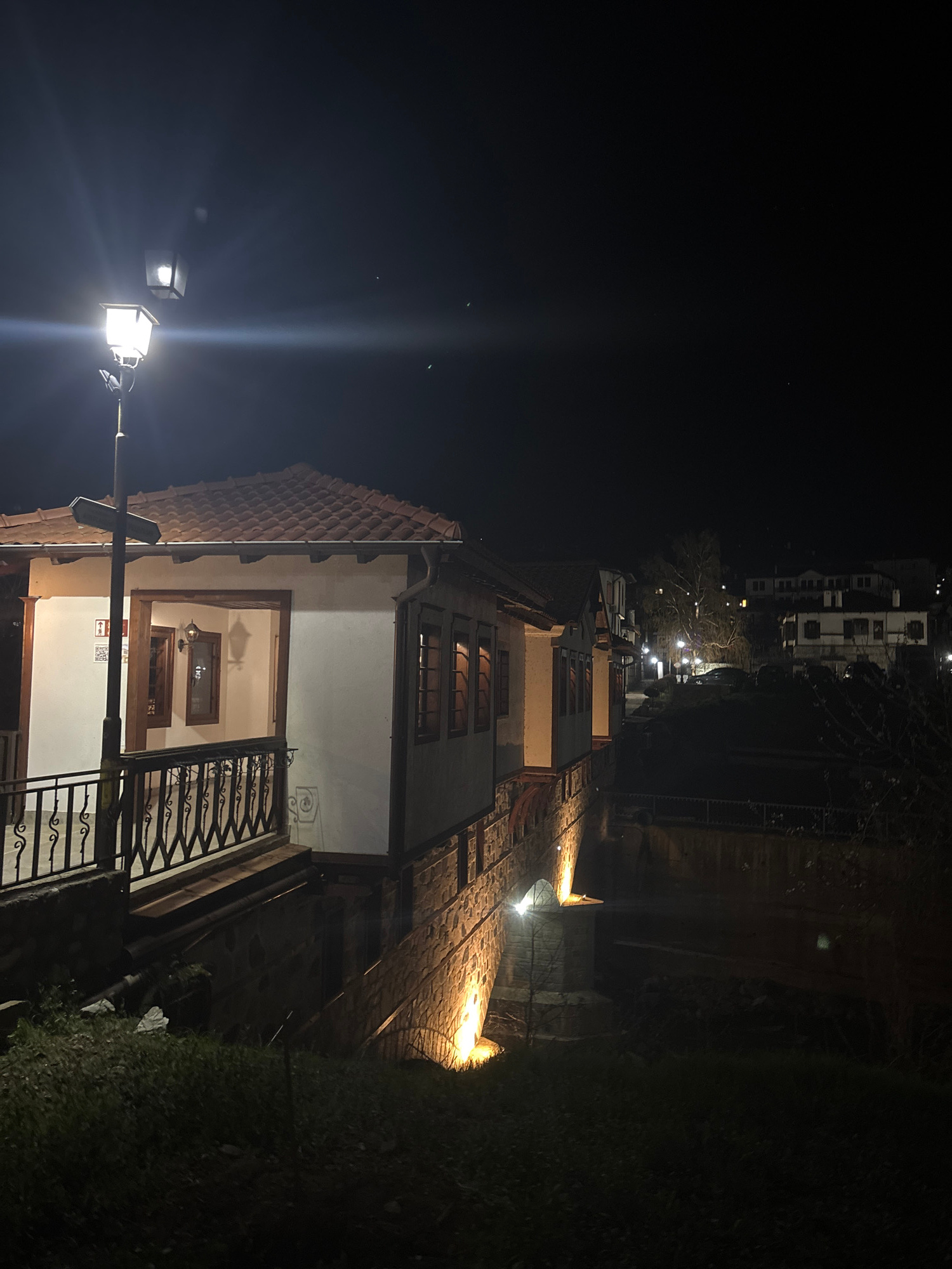 Captured at night in Zlatograd, Bulgaria, the image presents a streetscape illuminated by artificial lights. Buildings, primarily houses with tiled roofs and white walls, are situated along a cobblest…read more