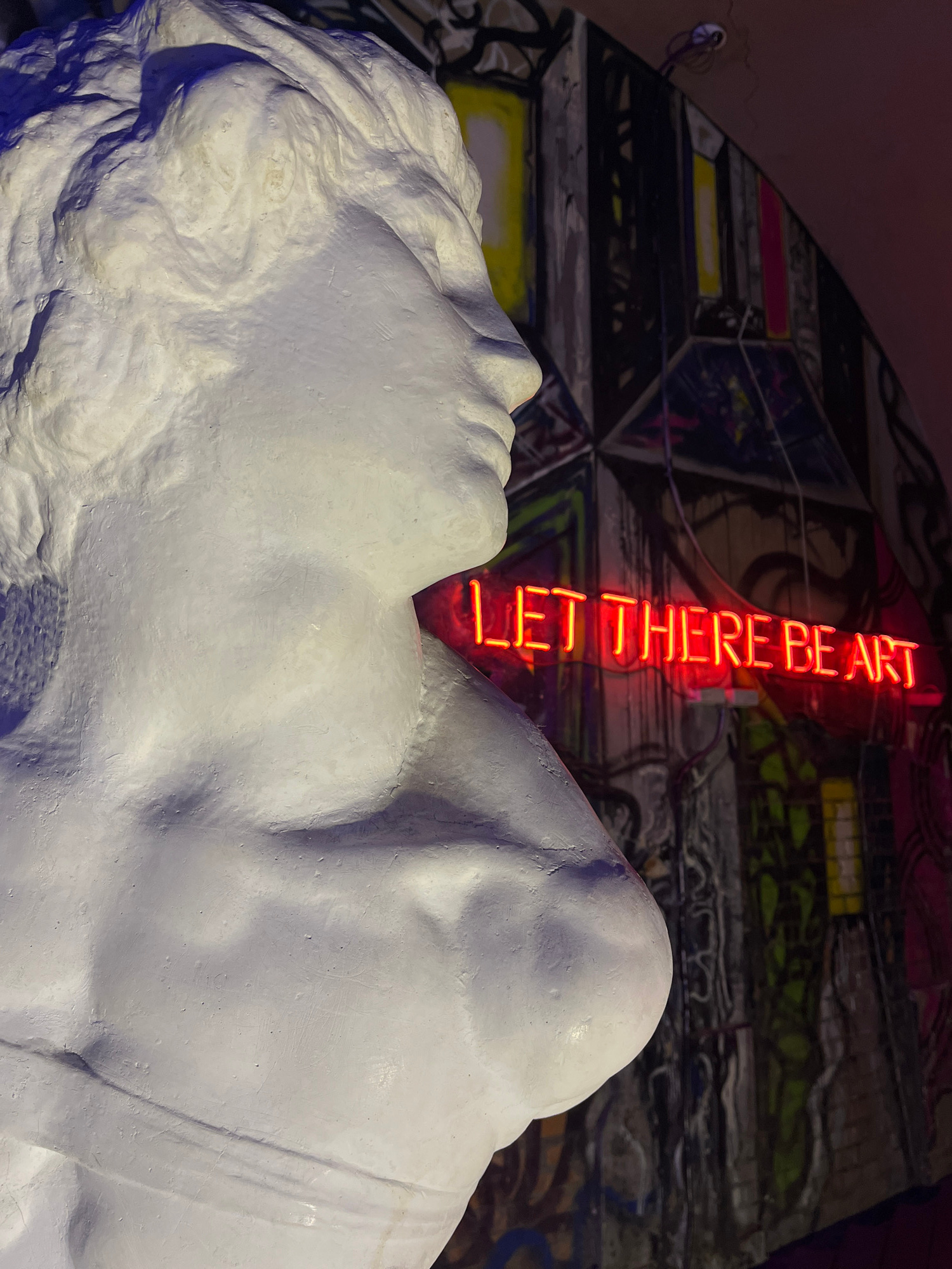 The image presents a close-up view of a white, textured sculpture of a reclining male figure, positioned in front of a wall adorned with graffiti or mural art. A neon sign reading "LET THERE BE ART" v…read more