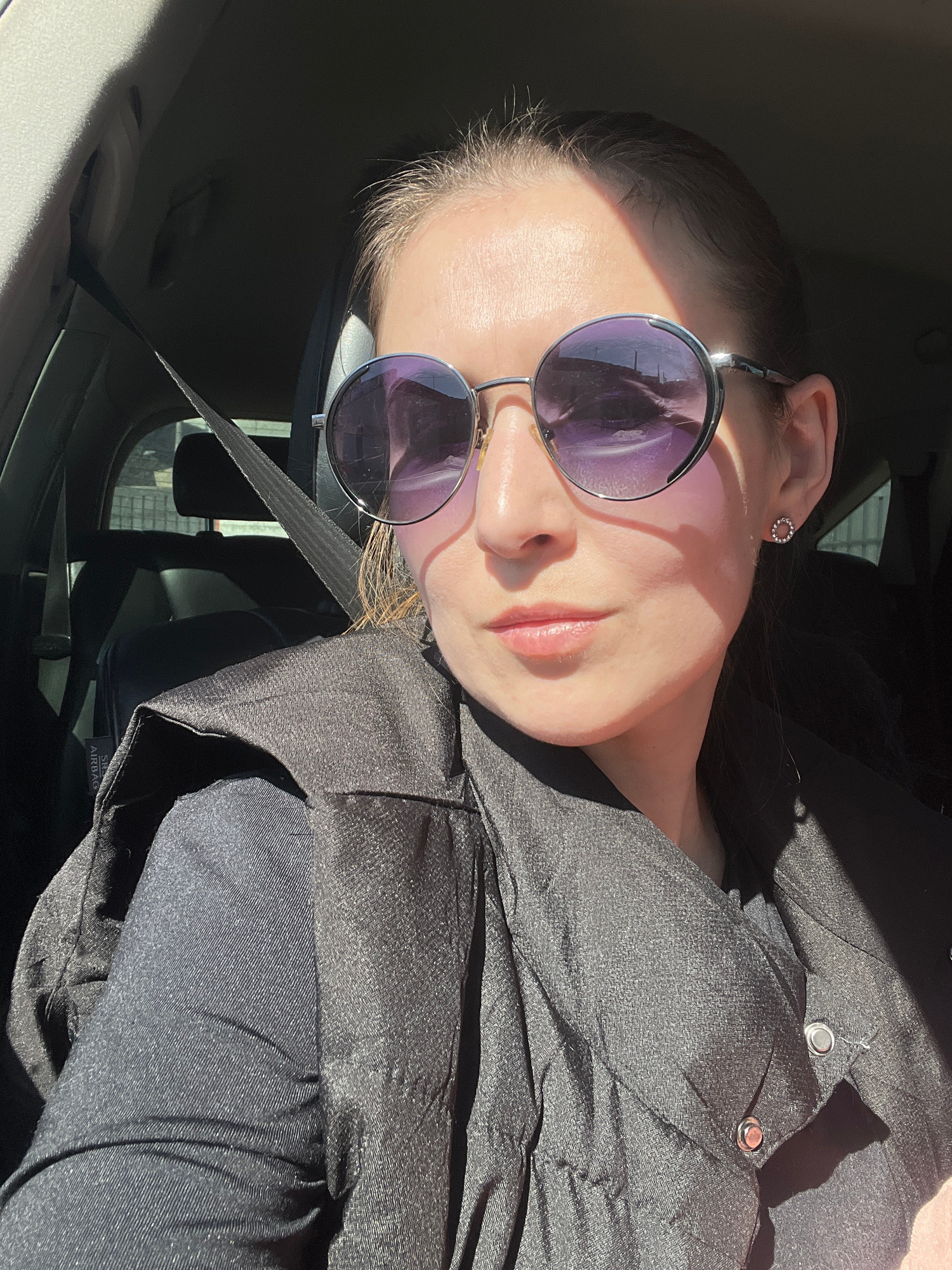 A woman is depicted from the upper torso, seated in what appears to be a car interior, likely in Votkinsk, Russia. She is wearing round, purple-tinted sunglasses that cover her eyes, and a small, circ…read more