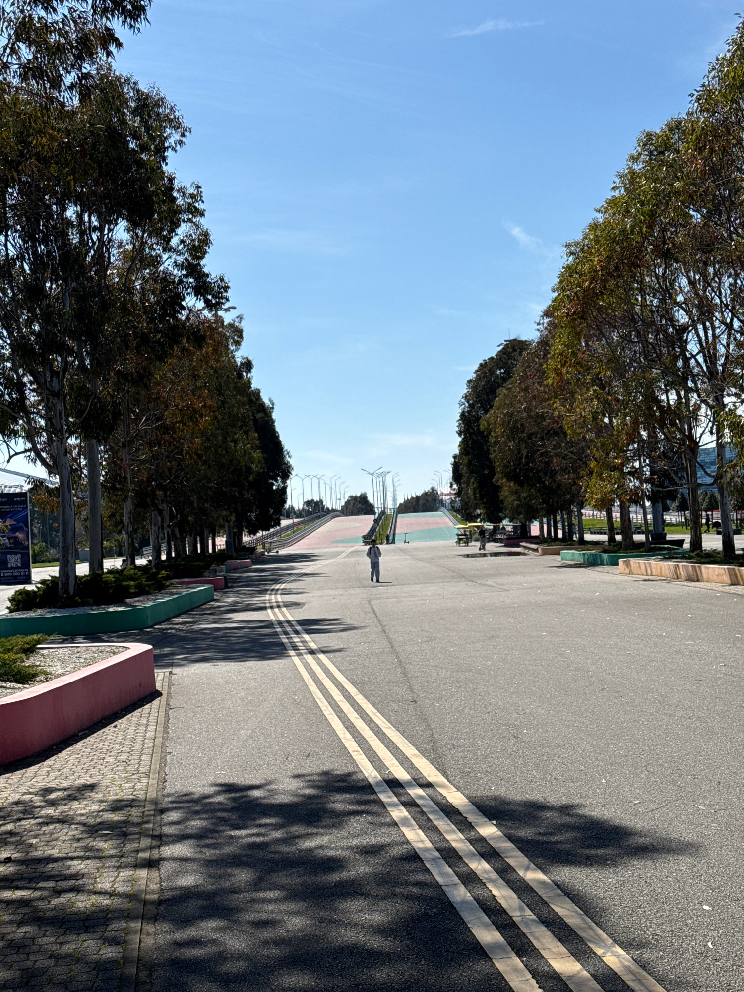 The image presents an outdoor scene tilted 90 degrees counter-clockwise, featuring a broad paved road or pathway flanked by trees under a bright blue sky. The horizon line runs diagonally across the m…read more