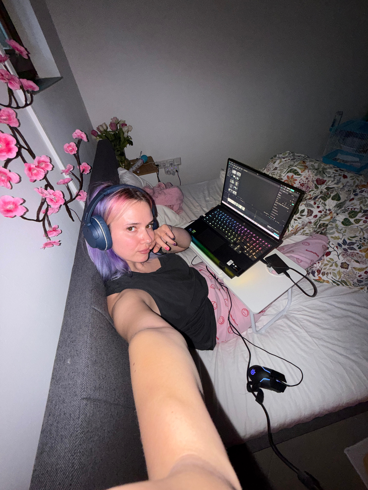 A female with light skin, purple and pink-rooted hair, and blue over-ear headphones is depicted lying on her left side on a bed, taking a selfie. She wears a dark t-shirt and pink pajama pants with wh…read more