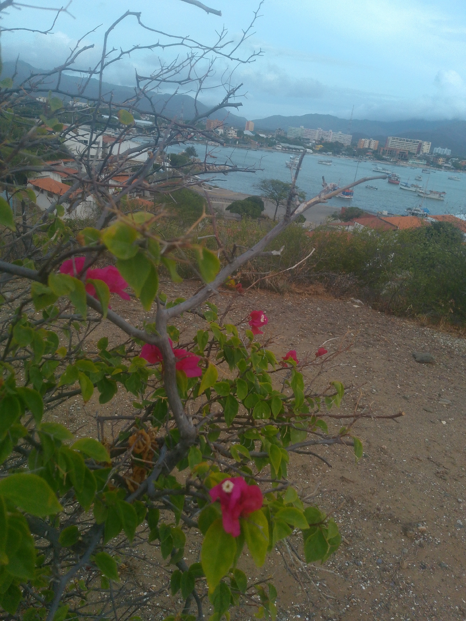 The scene is a view overlooking Juan Griego, Venezuela, from an elevated vantage point. In the foreground, there's a bougainvillea plant with pink flowers and green leaves, intertwined with bare branc…read more