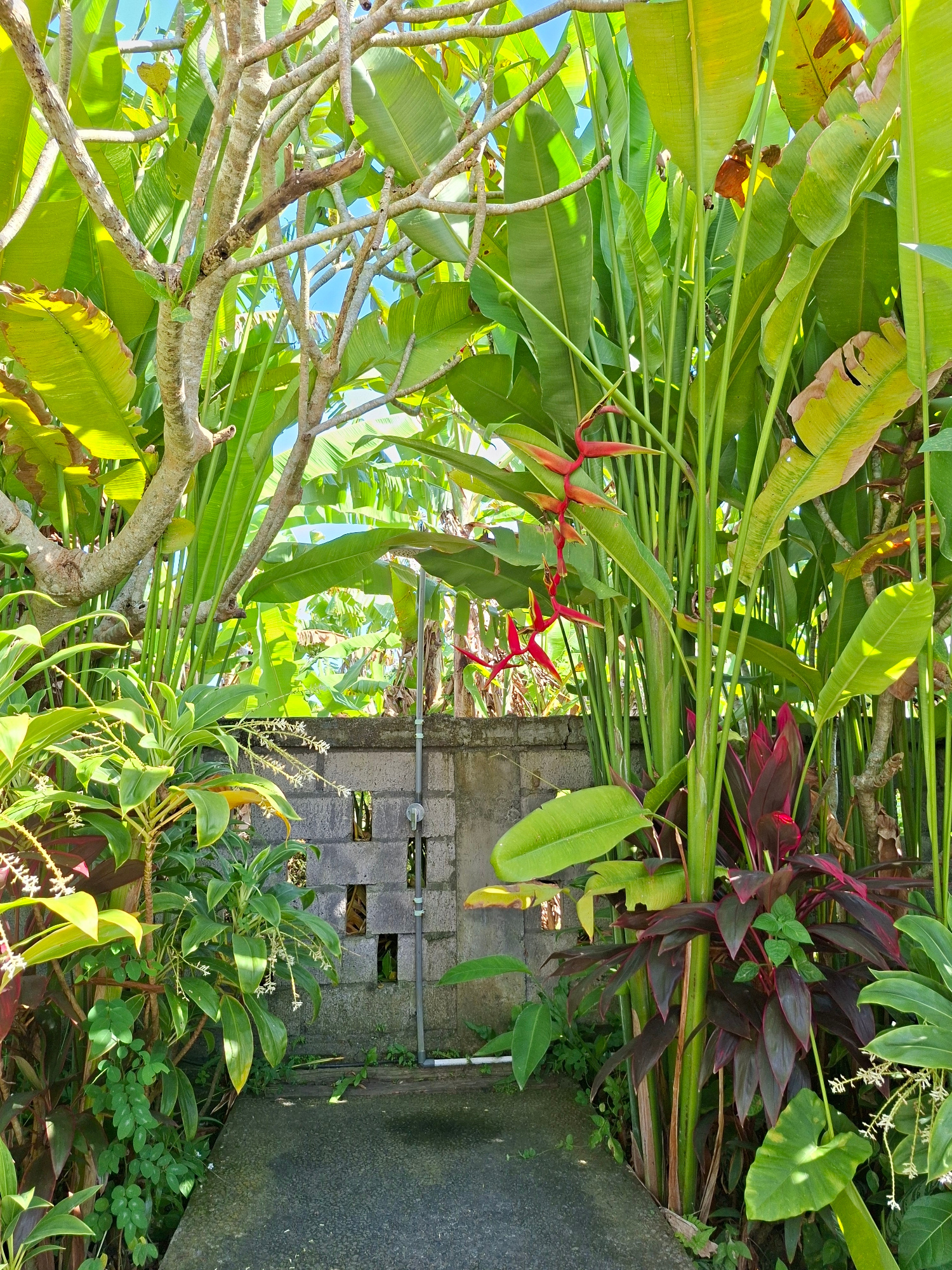 This image captures a vibrant, sunlit tropical garden scene, likely in the Ubud District of Indonesia. The upper and central parts of the frame are dominated by large, broad green leaves, possibly fro…read more