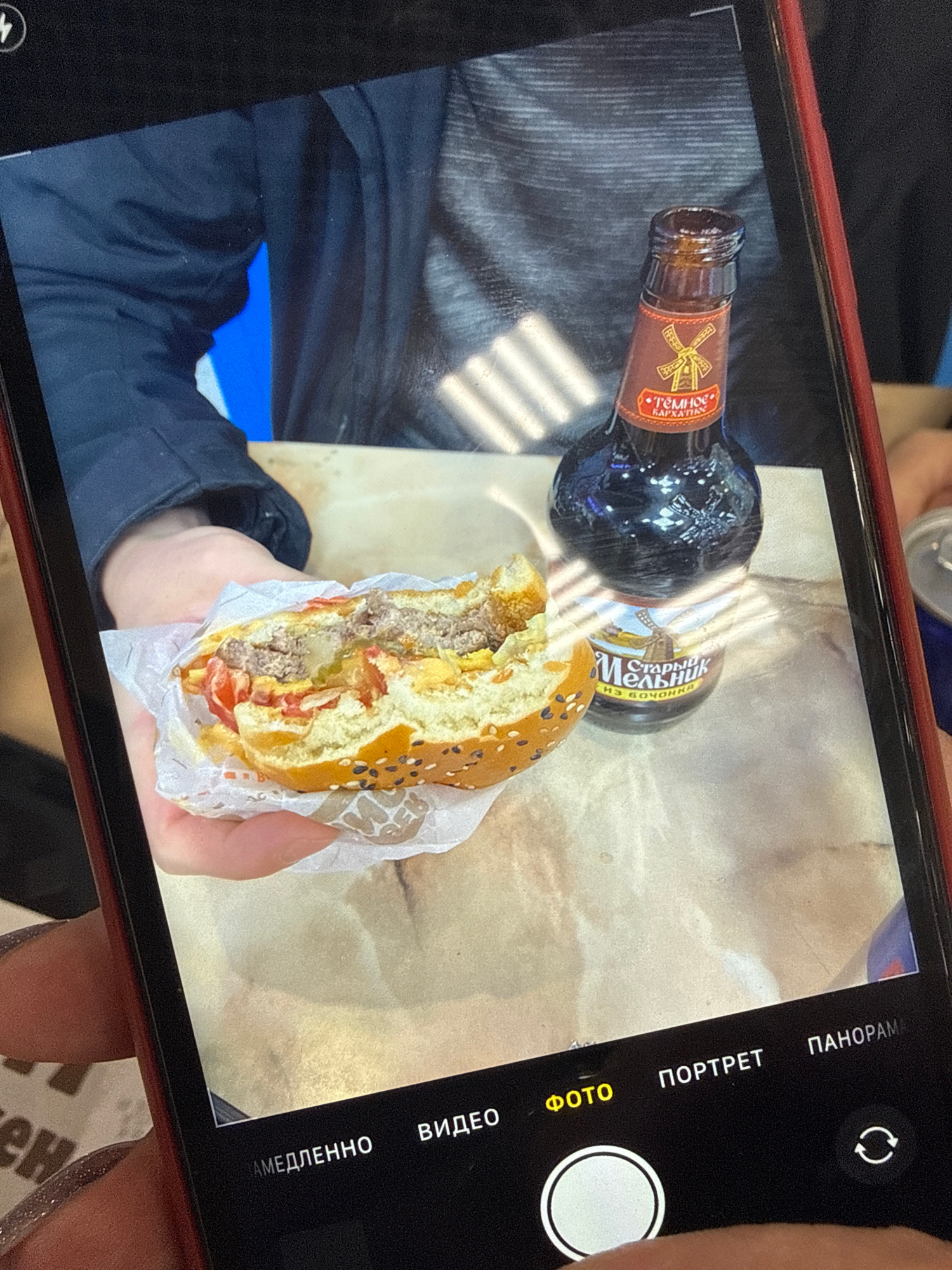 The image shows a smartphone displaying a photograph of a half-eaten burger and a bottle of "Старый Мельник" dark beer. The photo is likely taken in Dmitrov, Russia, based on the Cyrillic lettering on…read more