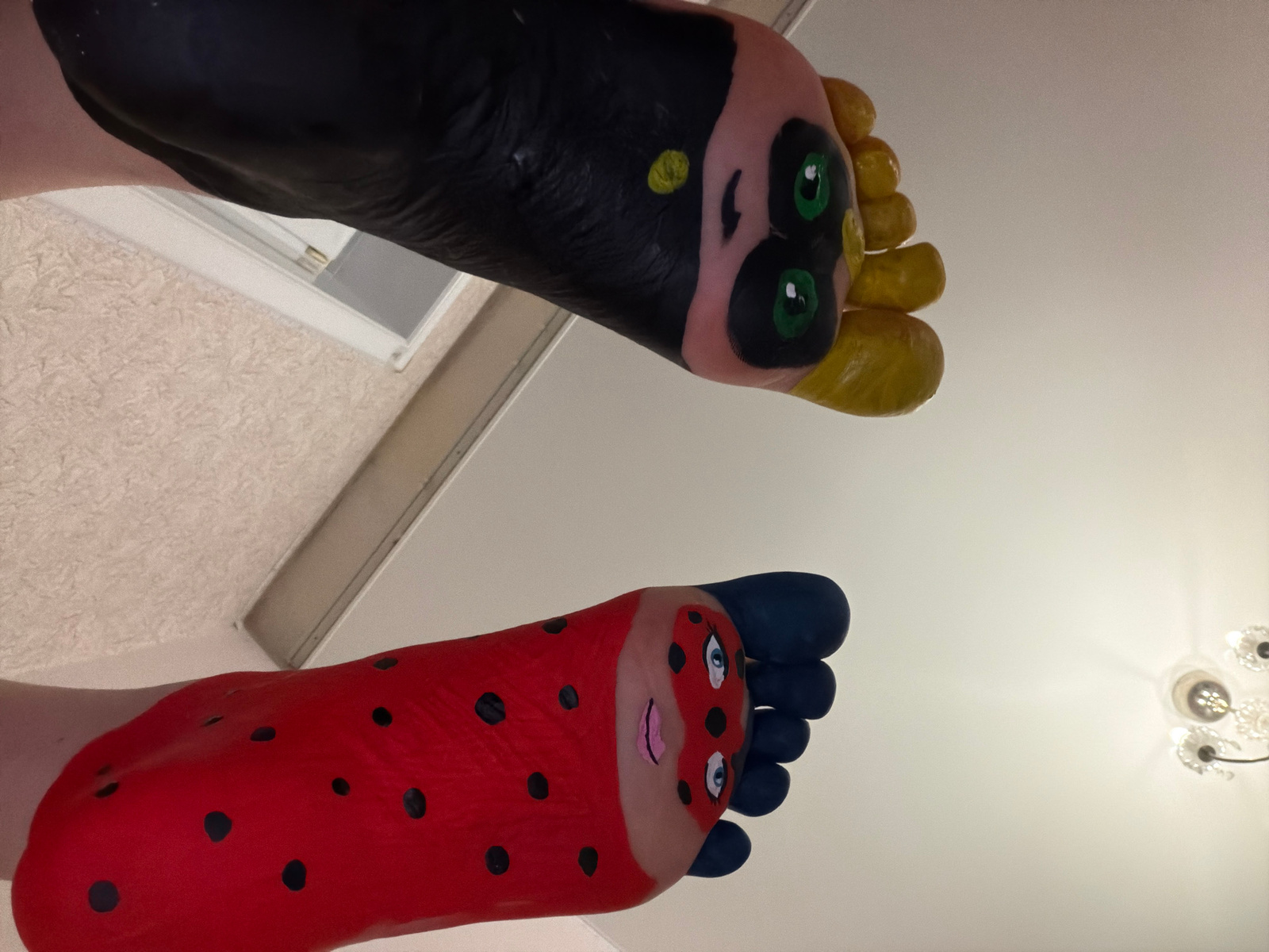 The image shows two feet, each painted to resemble characters from the animated series "Miraculous: Tales of Ladybug & Cat Noir." The right foot is painted red with black spots to represent Ladybug, a…read more