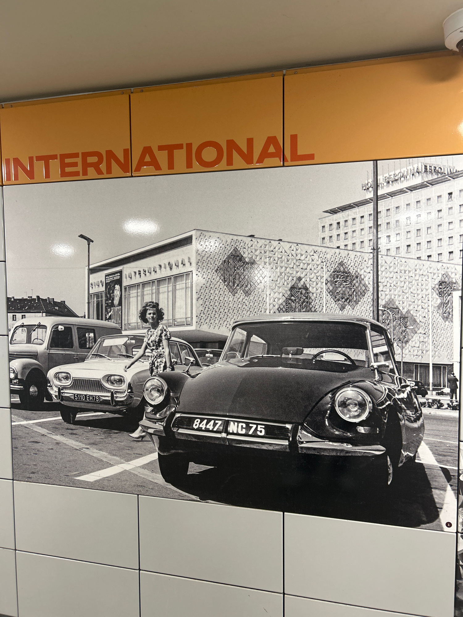 The image depicts a tiled wall in a public space, possibly a subway station. The tiles are arranged in panels. One section displays the word "INTERNATIONAL" in large orange capital letters against a y…read more