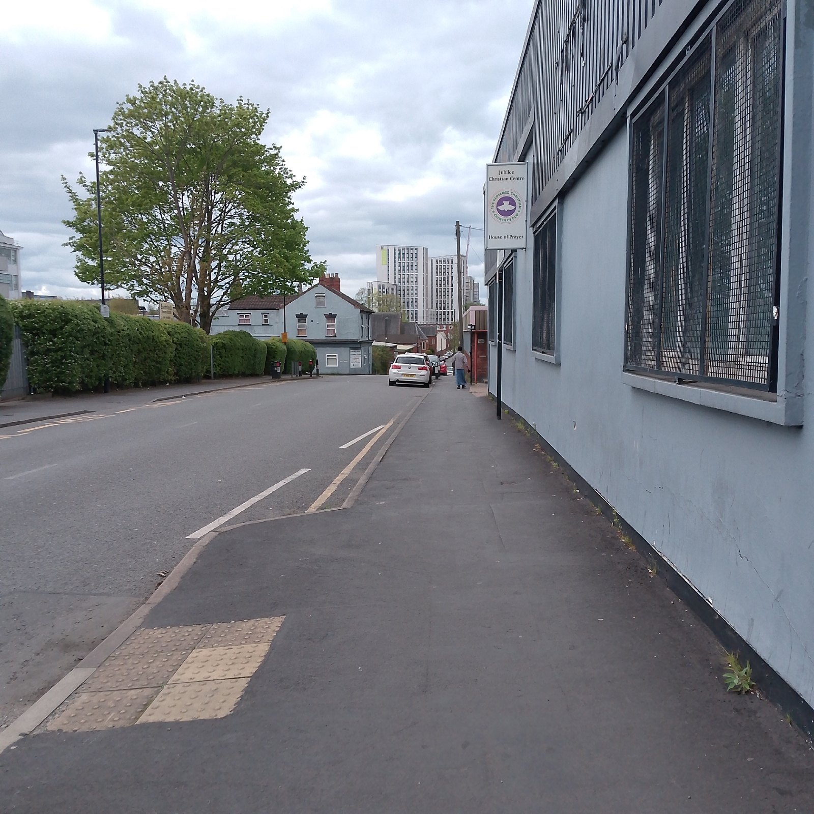 A street scene in Coventry, United Kingdom, shows a two-lane road with a sidewalk. The road is lined with a green hedge on the left and a large, light blue-grey building on the right, which has metal-…read more