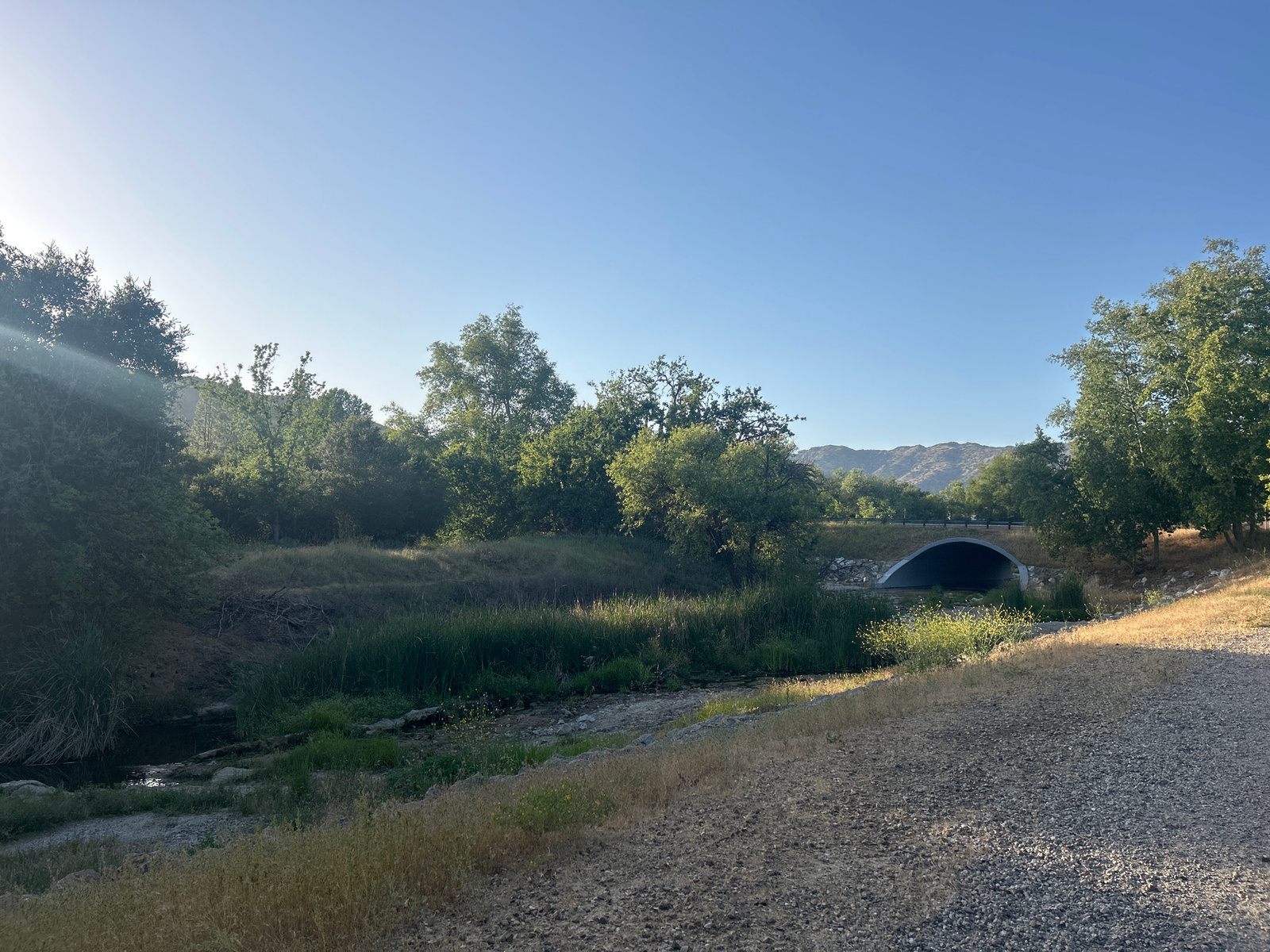 The image depicts a creek with sparse water flow under a bridge, bordered by vegetation and trees. A gravelly path is visible in the foreground. The scene is set in daylight under a clear, blue sky. T…read more