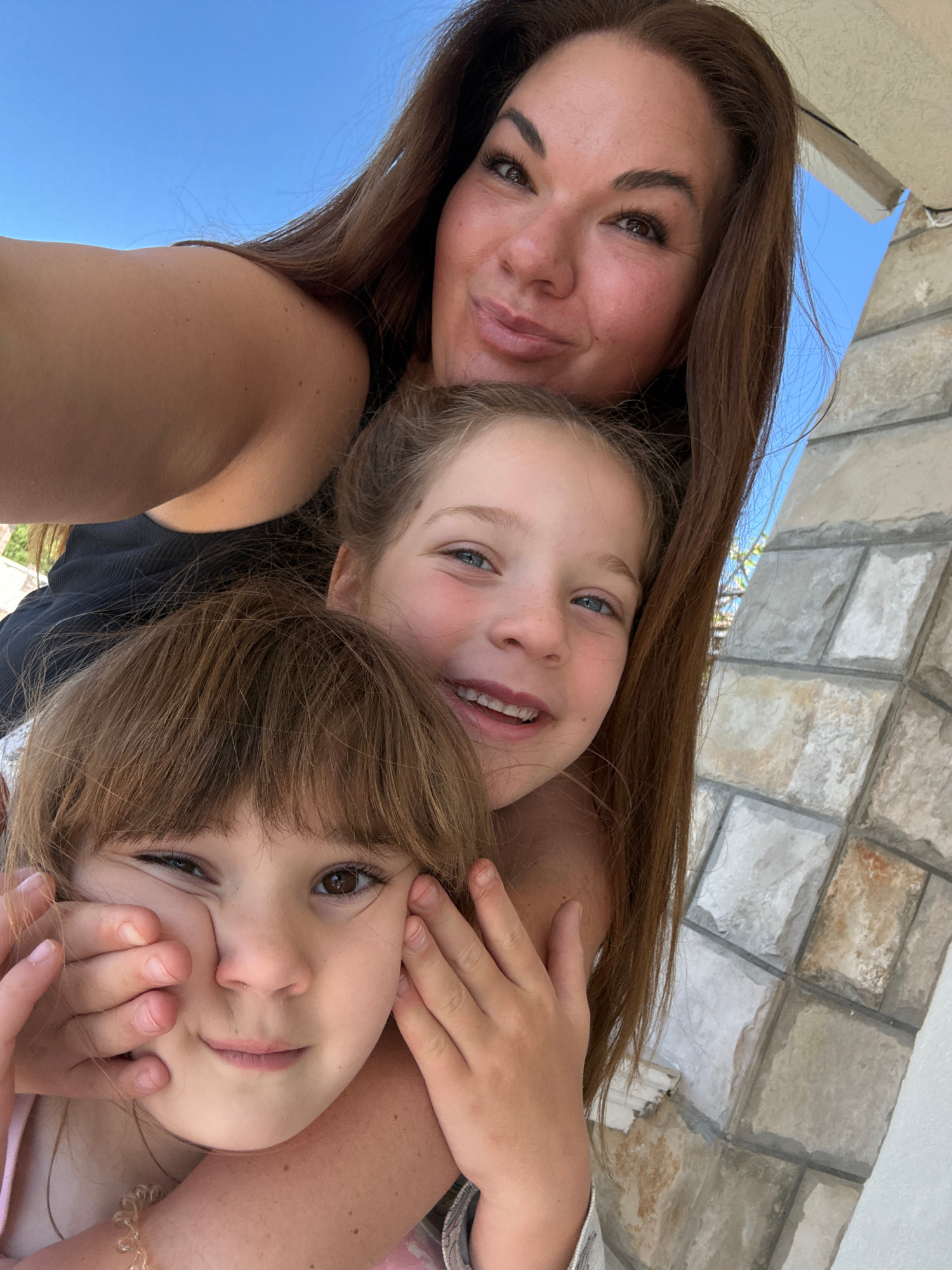 An overhead photograph depicts an adult woman and two young girls, all with brown hair, lying down or leaning back and looking up towards the camera. The subjects are arranged side-by-side, with the a…read more