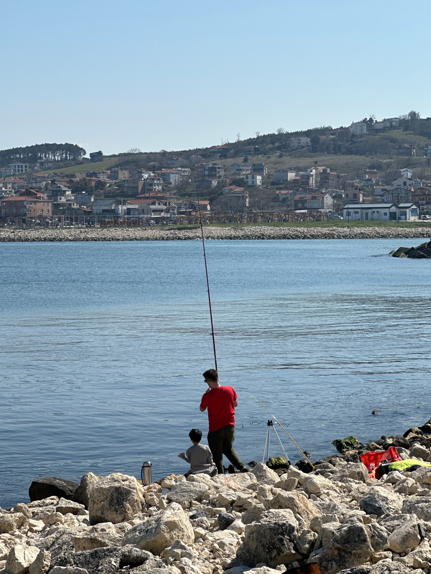 A medium, eye-level, outdoor shot shows two men fishing from a rocky shoreline on a sunny day in Arnavutköy, Turkey. The man in the foreground, closer to the camera, is wearing a red shirt and dark pa…read more