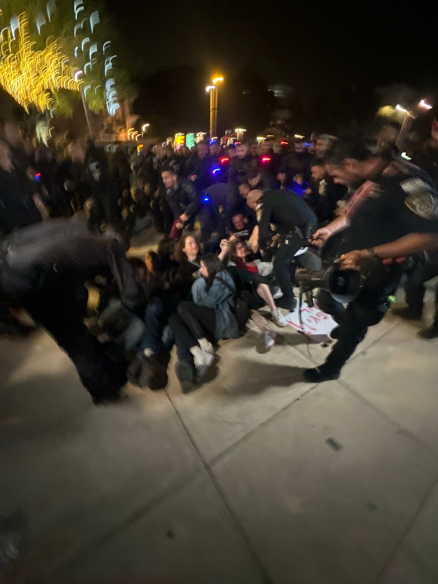 The image shows a large group of people gathered at night. Some individuals appear to be lying on the ground, while others are standing around them. Several figures are holding megaphones. The locatioβ¦read more