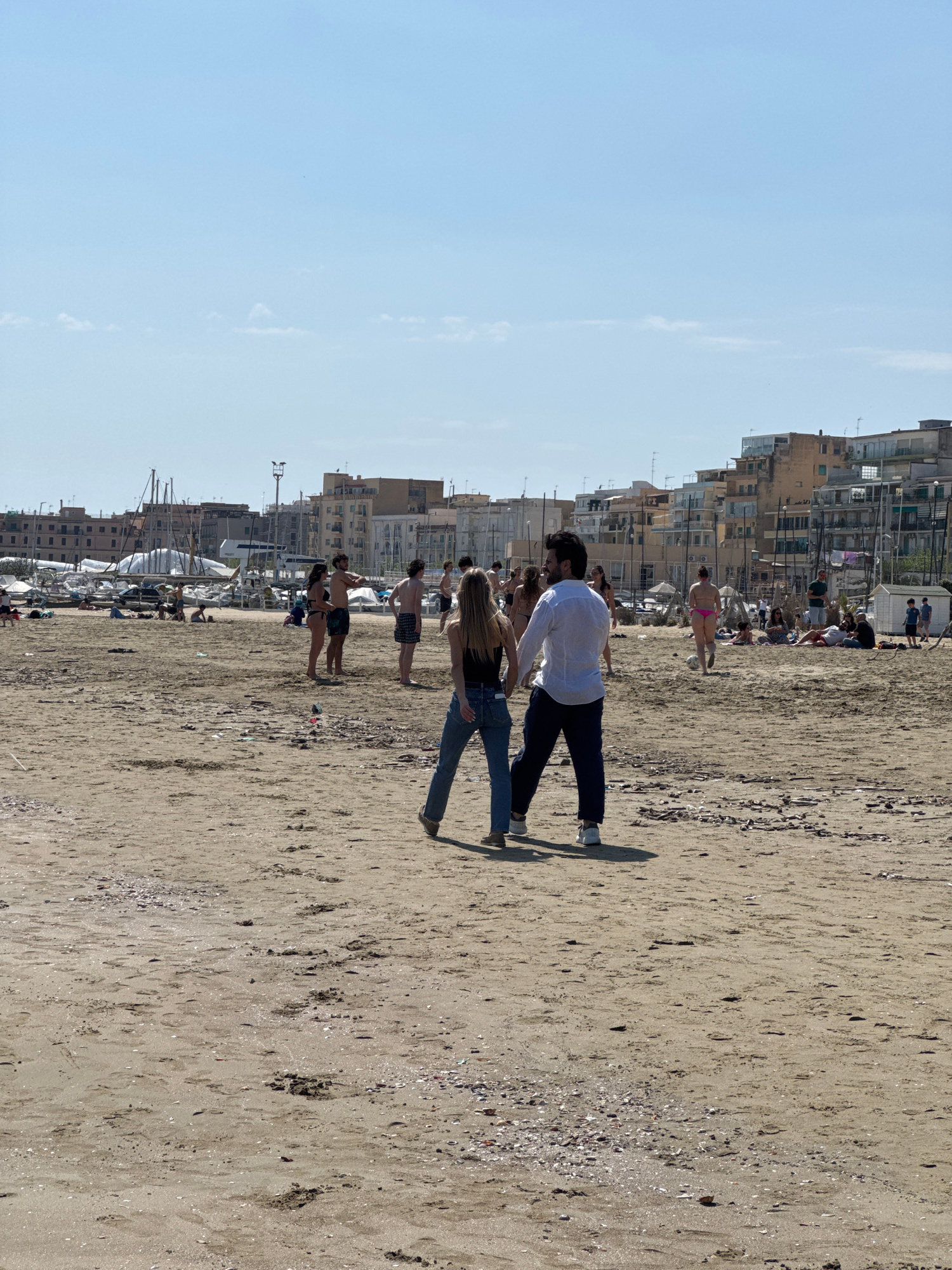 The image captures a scene on a beach in Anzio, Italy, evident from the background architecture and the presence of boats along the coastline. The foreground is dominated by sandy beach. A man in a w…read more