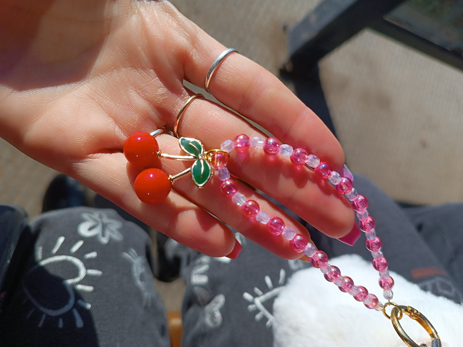 A person's hand holds a cherry keychain and a beaded chain. The hand has two rings, one silver and one gold. The cherry keychain has two red cherries and green leaves. The beaded chain is pink and whi…read more