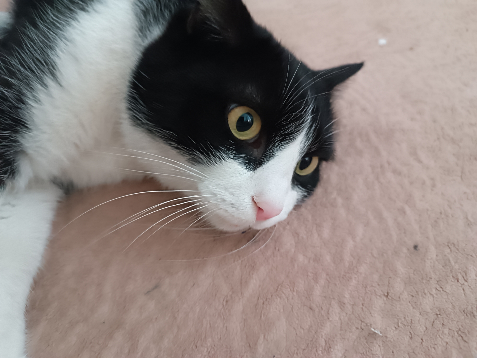 A black and white domestic cat with yellow eyes and a pink nose is lying on a pink fabric surface. The cat is in a prone position, angled slightly towards the right side of the frame. The background i…read more