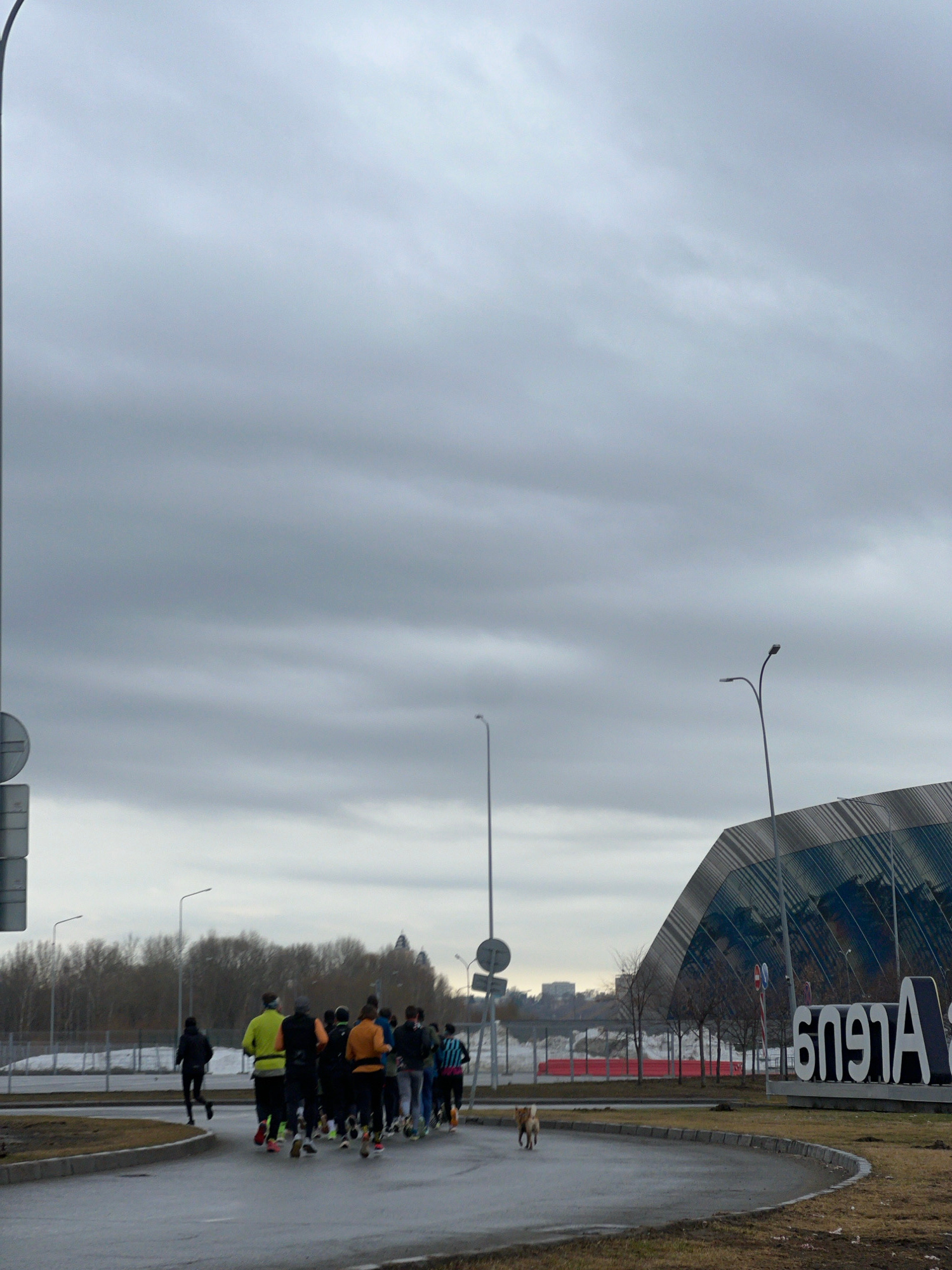 The image depicts an outdoor scene in Kazan, Russia, as evidenced by the "Kazan Arena" sign on the building in the background. A large group of people is gathered on a wet road or path, seemingly abou…read more