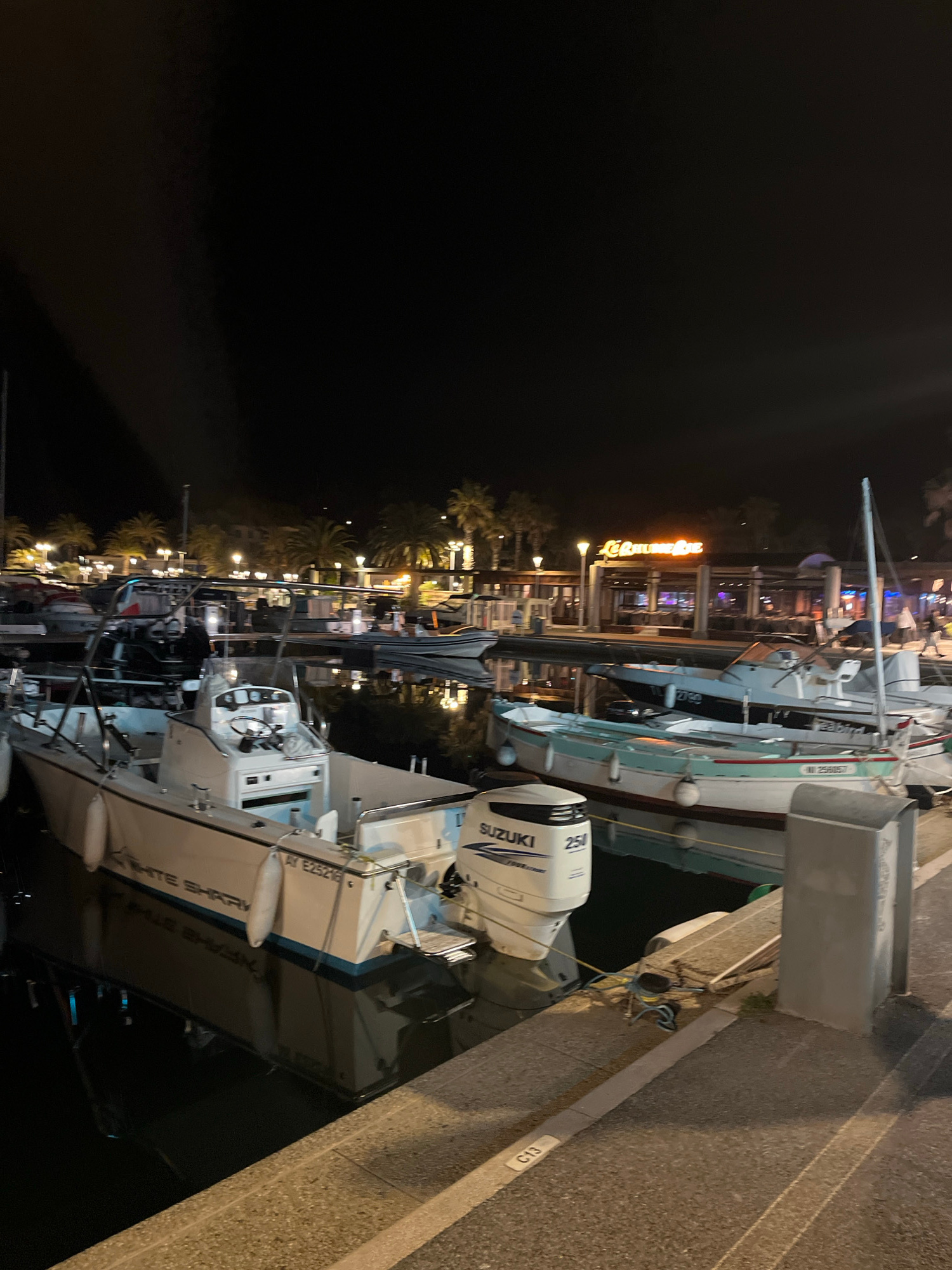 At night in Cavalaire-sur-Mer, France, boats are docked in a marina. The closest boat, partially visible, is white with the name "White Shark" inscribed. Next to it is another boat with a "Suzuki" mot…read more