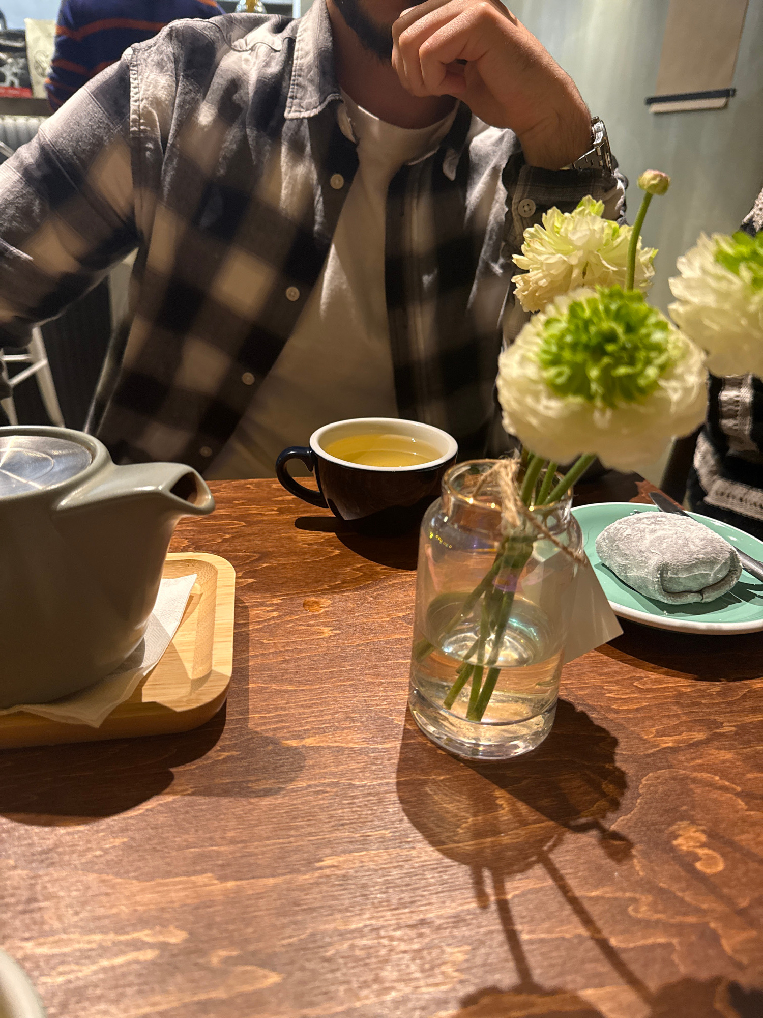 A medium-shot, angled, eye-level view depicts a wooden table at a cafe, featuring a tea set including a black cup of tea, a grey teapot on a small wooden tray, and a small glass vase containing white…read more