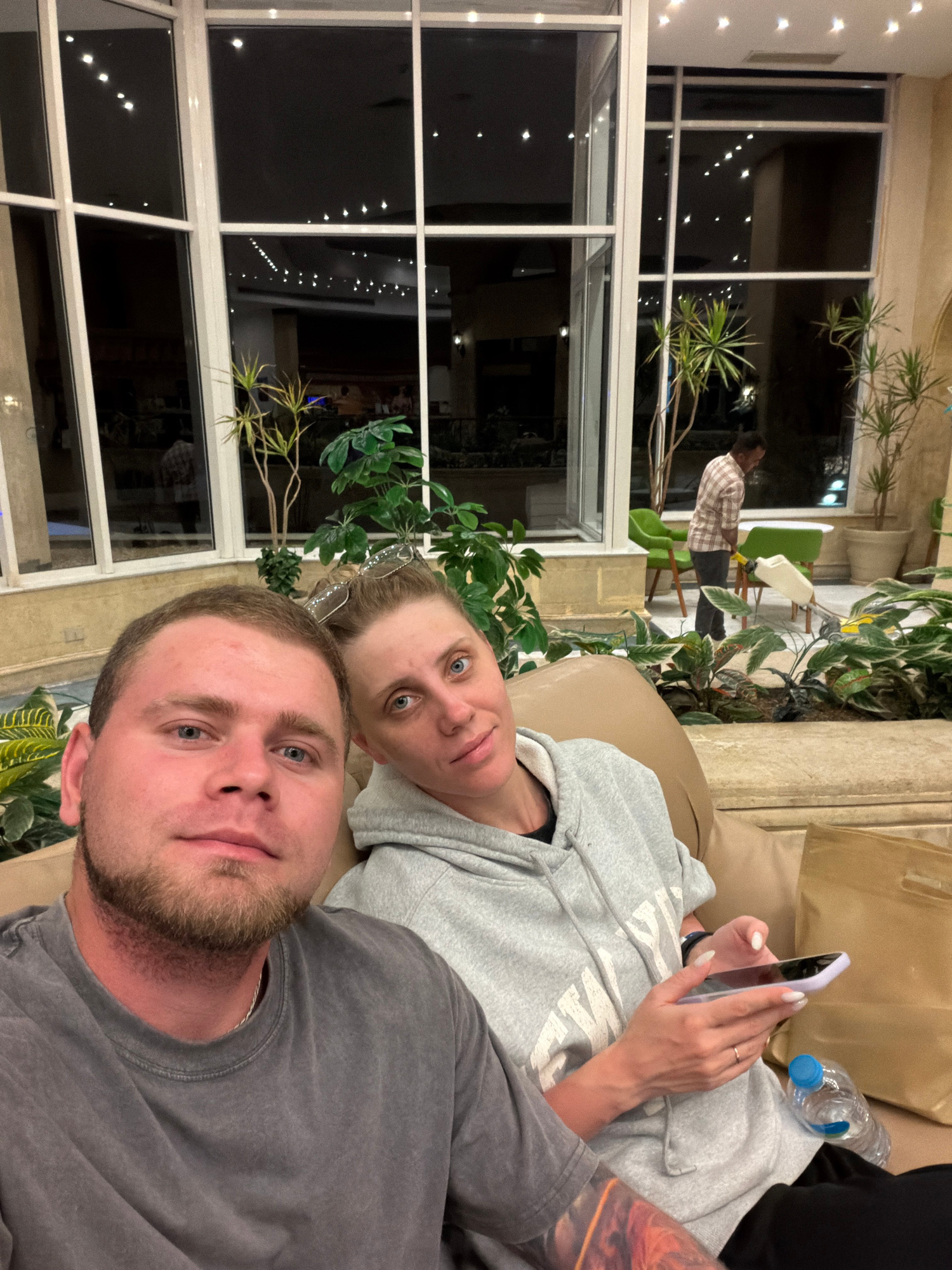 The image captures a close-up of a man and a woman, possibly a couple, posing for a selfie. The man is in the foreground wearing a gray t-shirt, while the woman is behind him, wearing a gray hoodie an…read more