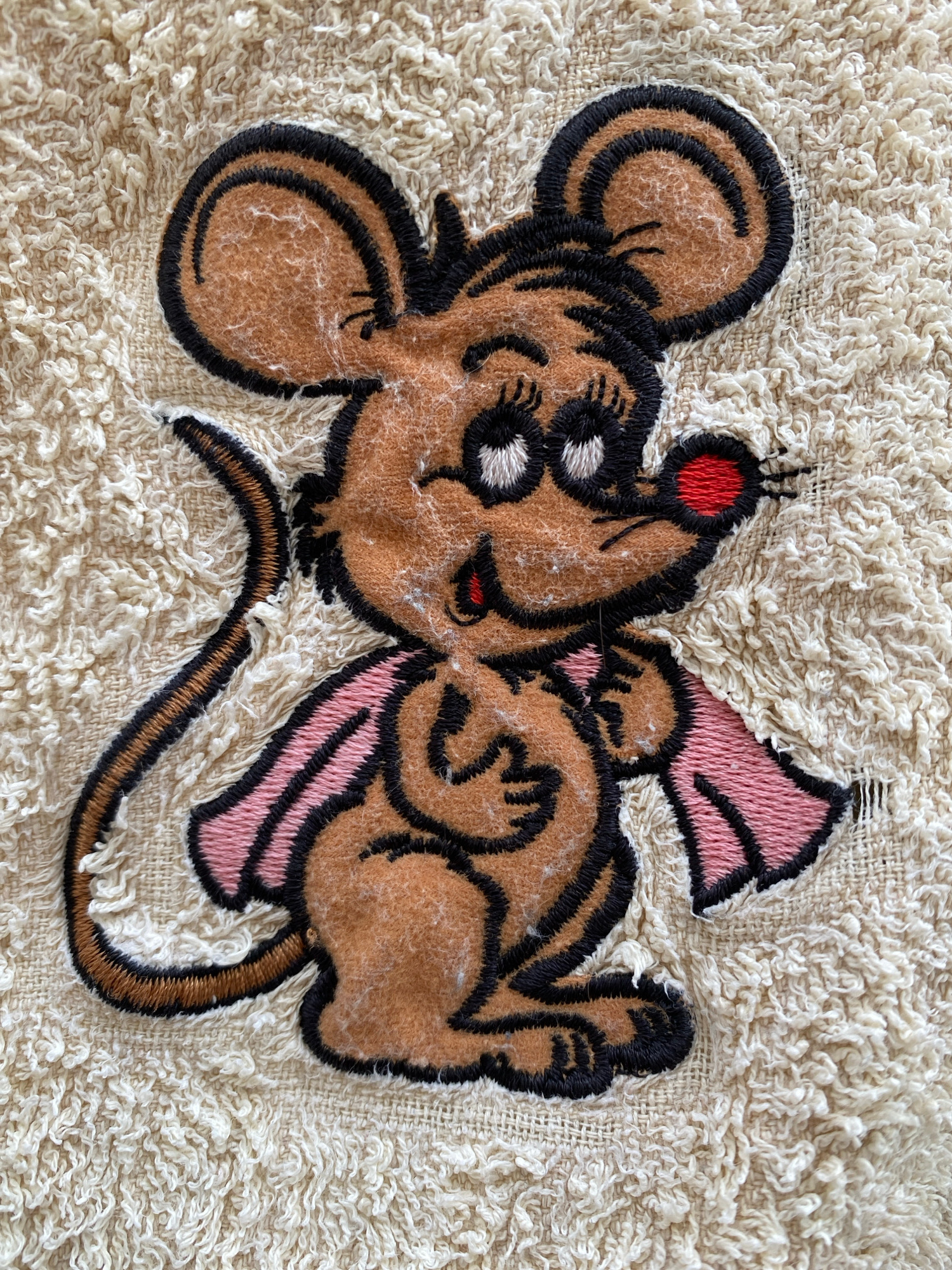 An embroidered patch featuring a brown cartoon mouse is centrally displayed against a cream-colored, looped fabric background, likely terrycloth. The mouse is outlined in black stitching and possesses…read more