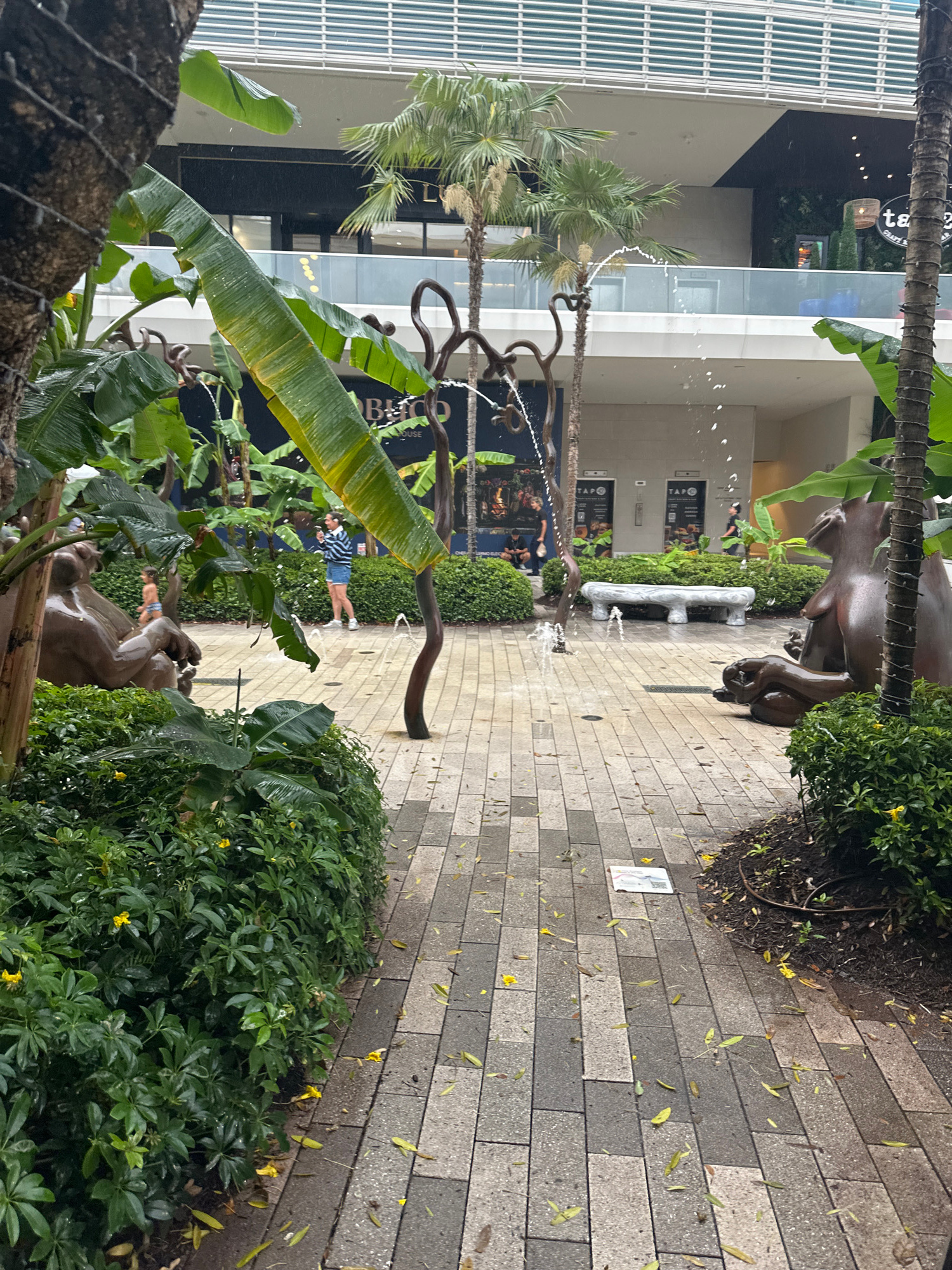 The photo shows an outdoor scene in Aventura, Florida, United States. The ground is paved with gray bricks, and there are several plants and trees, including banana trees. Two bronze statues of monkey…read more