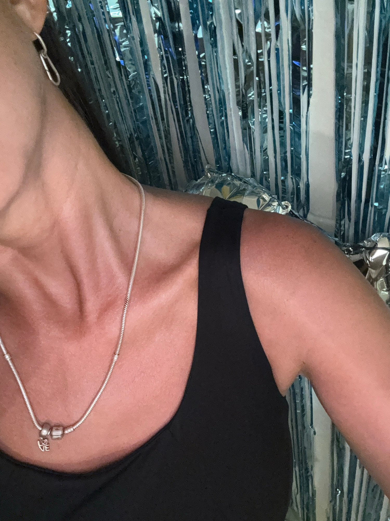 The image captures a close-up, high-angle view of a person, focusing on their neck, collarbone, shoulder, and upper arm. The person is wearing a black top with a broad strap visible over the shoulder.…read more
