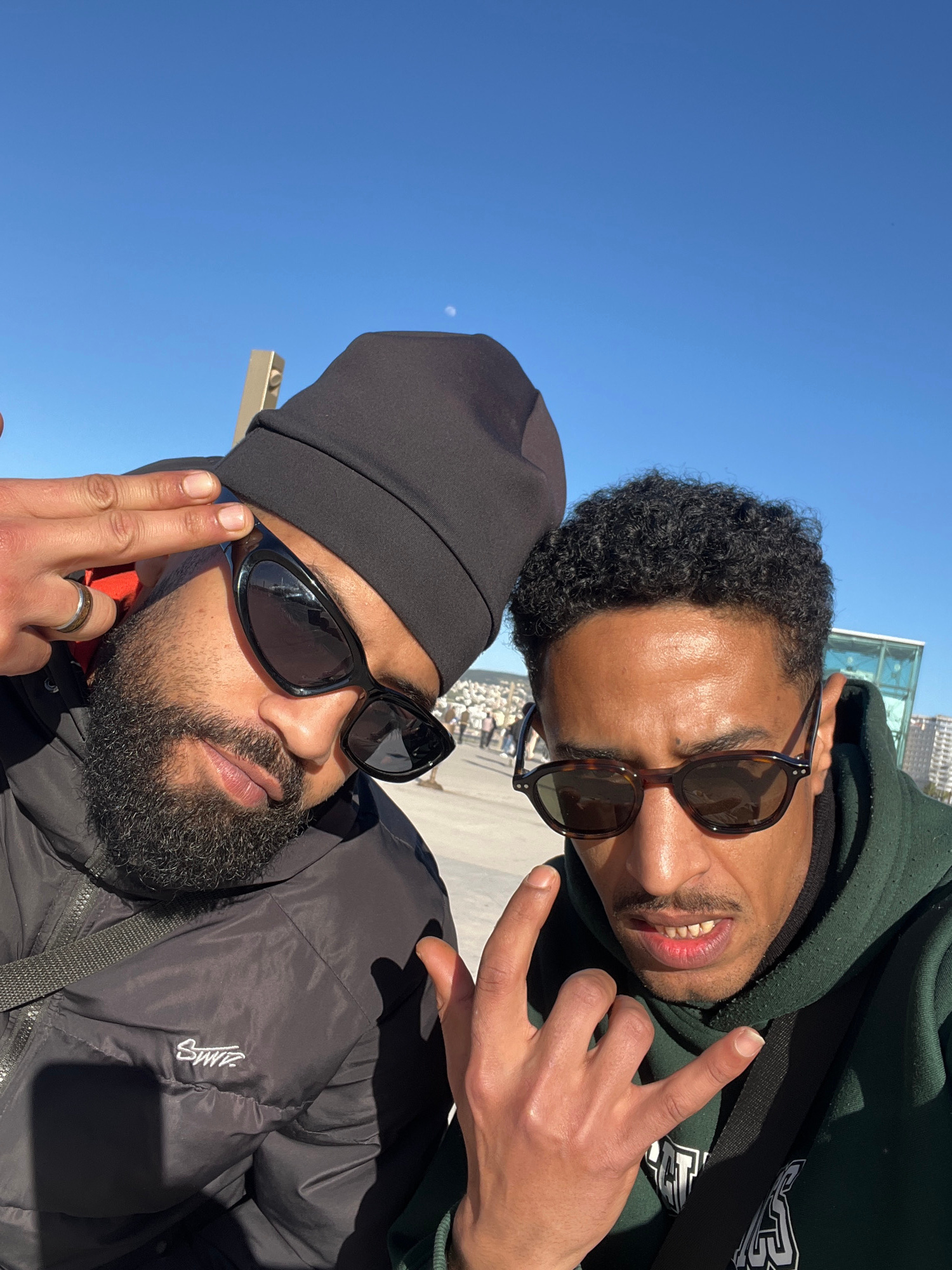 Two men pose for a selfie against a bright blue sky, likely in Tanger, Morocco. The man in the foreground wears a black beanie, dark sunglasses, and a black puffer jacket with a white logo on the slee…read more
