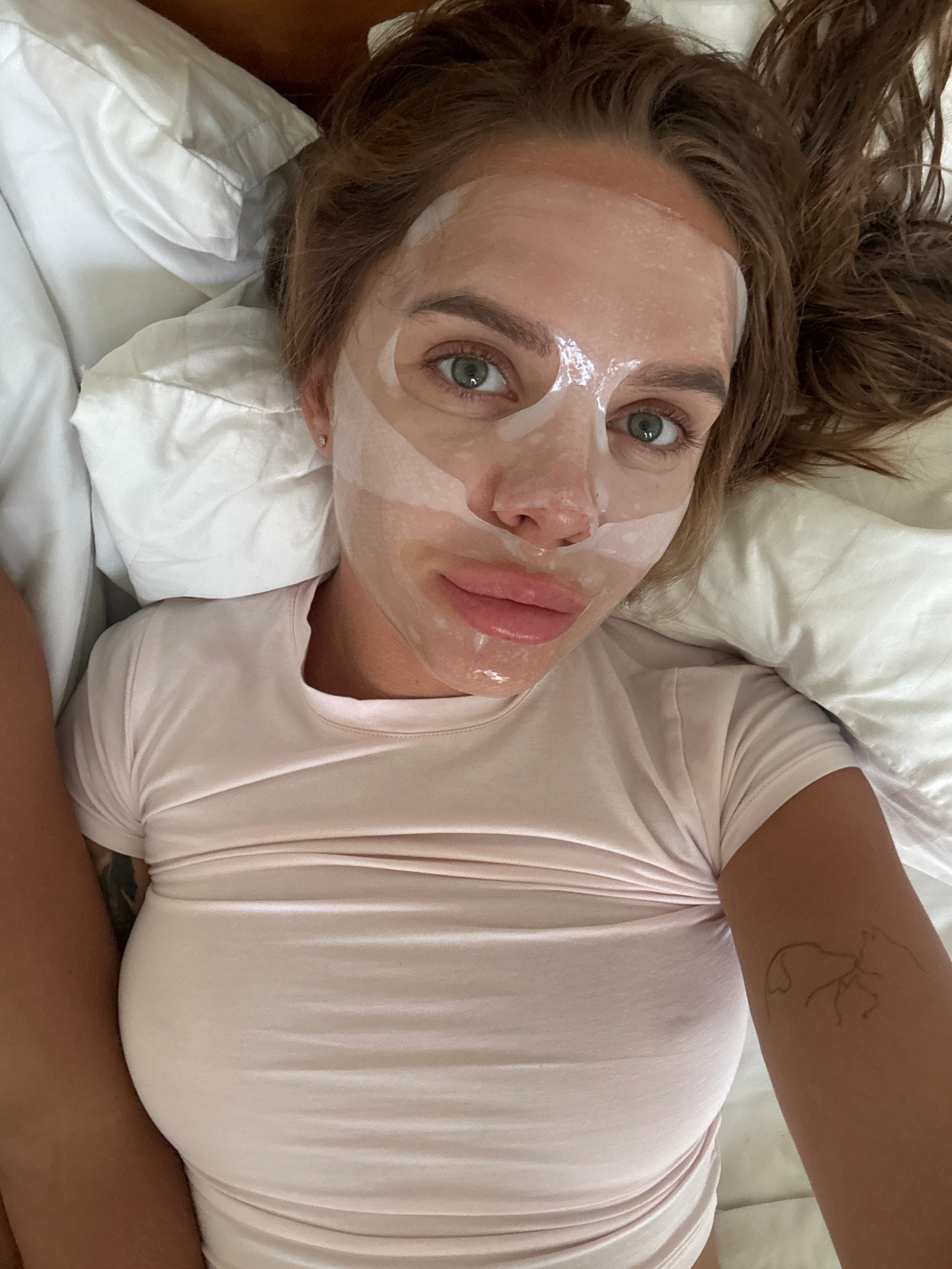 A woman is reclining on a white pillow in what appears to be a bed. She is wearing a pink t-shirt and has a facial mask applied. Her hair is brown and disheveled around her head. The location and date…read more