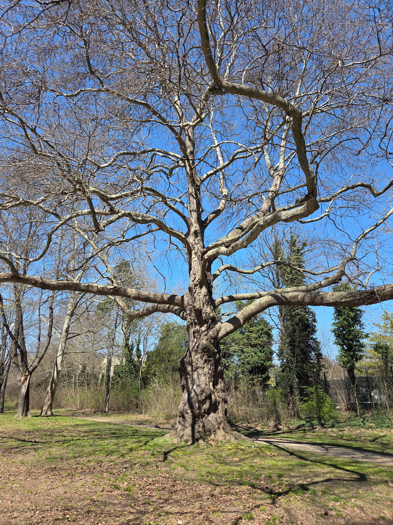The image captures a large, bare tree with expansive branches against a clear, blue sky. The tree's trunk is thick and textured, indicating age. The surrounding area appears to be a park or wooded are…read more