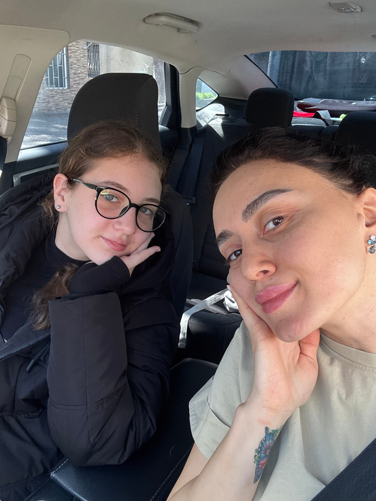 Two individuals are in a car. One woman, presumably the older one, is in a light-colored shirt with a butterfly tattoo on her wrist. She is leaning towards the camera. The younger woman wears glasses…read more