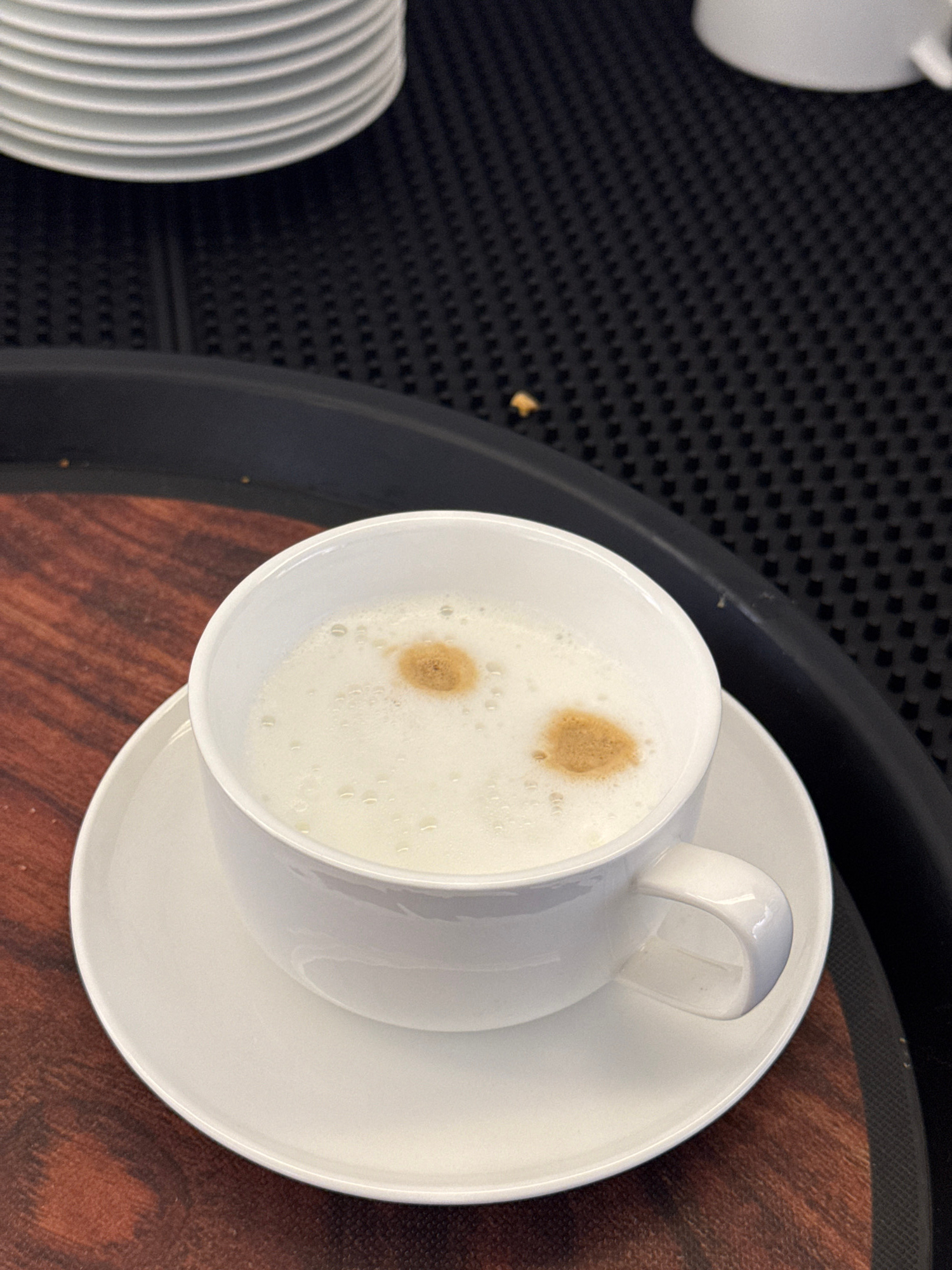 A high-angle shot shows a white ceramic cup of latte or cappuccino with two small, light-brown spots of espresso foam on top, sitting on a white saucer. The cup and saucer are placed on a brown surfac…read more