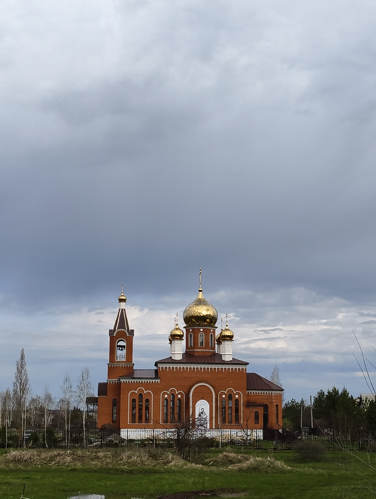The image features a brick Orthodox church located in Balashov, Russia. The church has multiple golden domes and a bell tower. The sky is overcast with dark clouds. The foreground consists of a grassy…read more