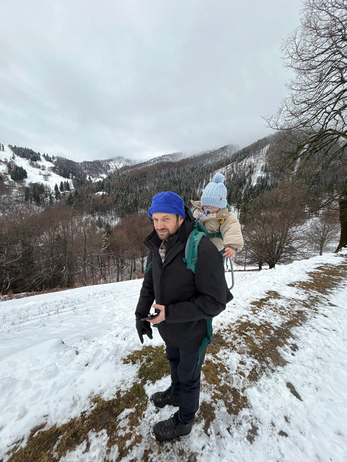 A man carries a child on his back in a carrier on a snowy, hilly landscape. The man wears a blue beanie and a black jacket, while the child has a light blue beanie and a beige jacket. The snowy terrai…read more