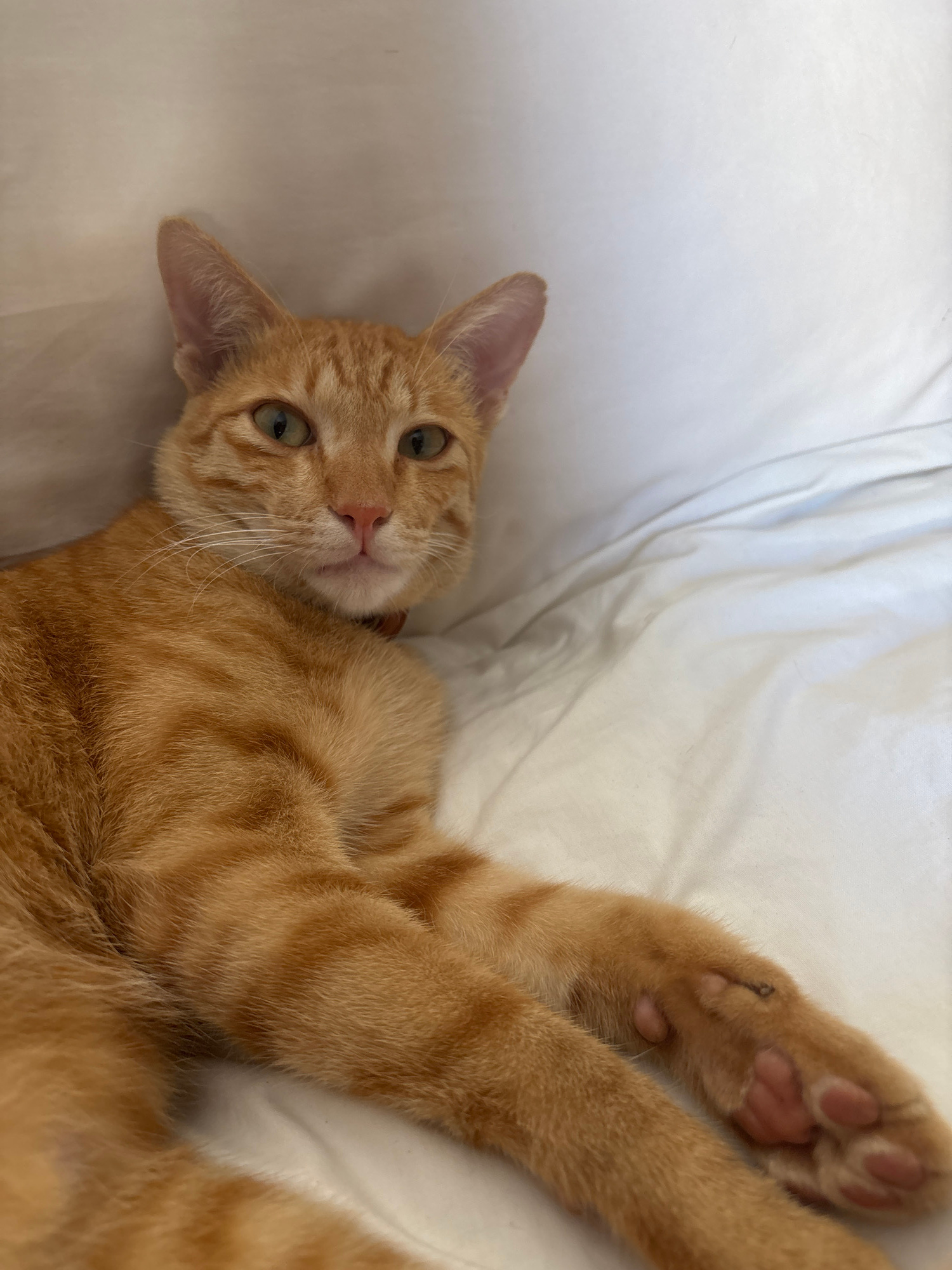 An orange tabby cat lies on its back on a white, wrinkled surface. The cat's head is positioned towards the left side of the image, and it gazes directly at the camera. Its paws are visible on the rigβ¦read more