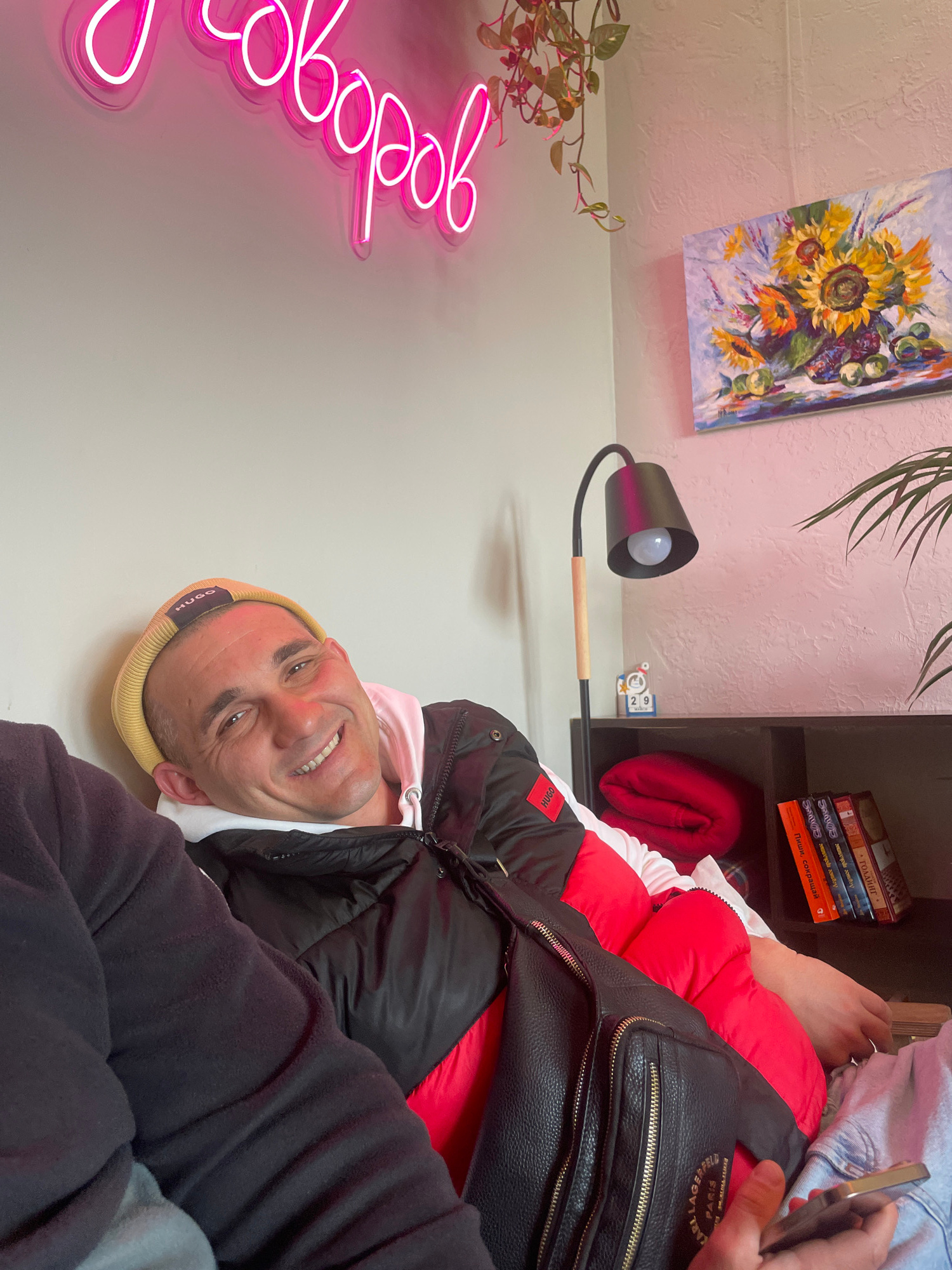 The image presents a selfie featuring a man with a slight smile, wearing a yellow beanie with the word "HUGO" on it. He has on a black jacket over a white hoodie. He appears to be indoors, against a l…read more
