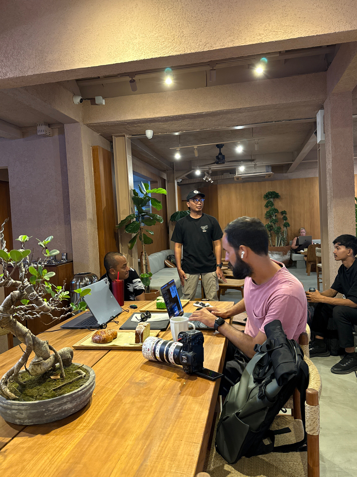 The image captures an indoor scene, likely a cafe, co-working space, or casual meeting area, characterized by warm wooden tables and structural elements, complemented by textured beige walls and ceili…read more