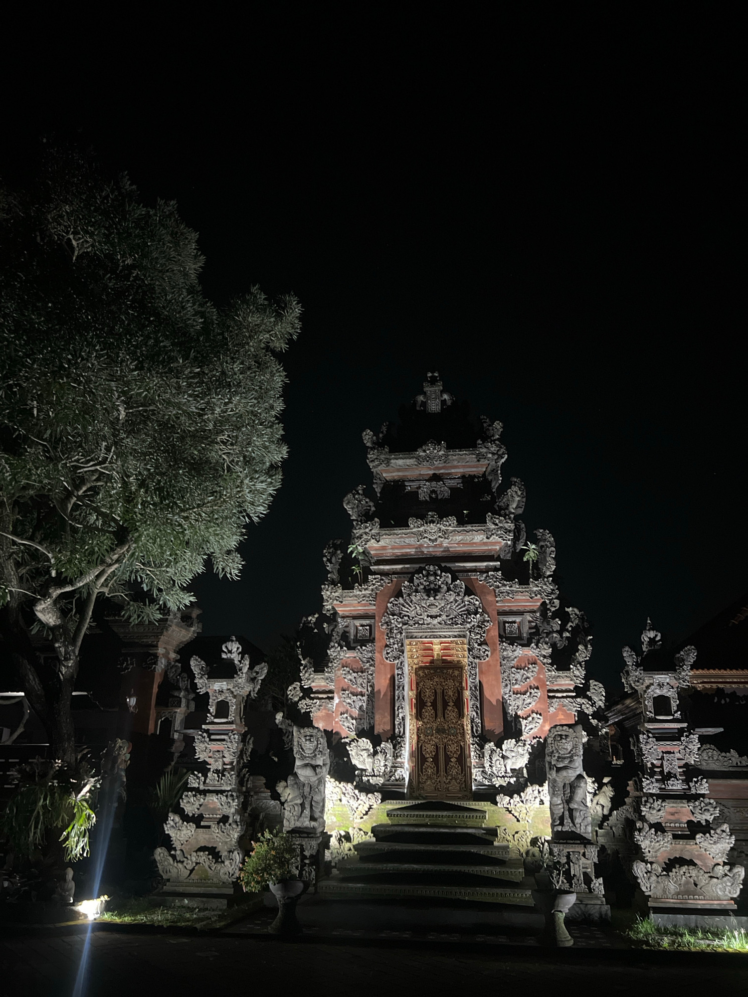 Captured at night in Blahbatuh, Indonesia, the image features a traditional Balinese structure. This intricately carved structure displays a symmetrical design with a central entrance. Stone carvings…read more